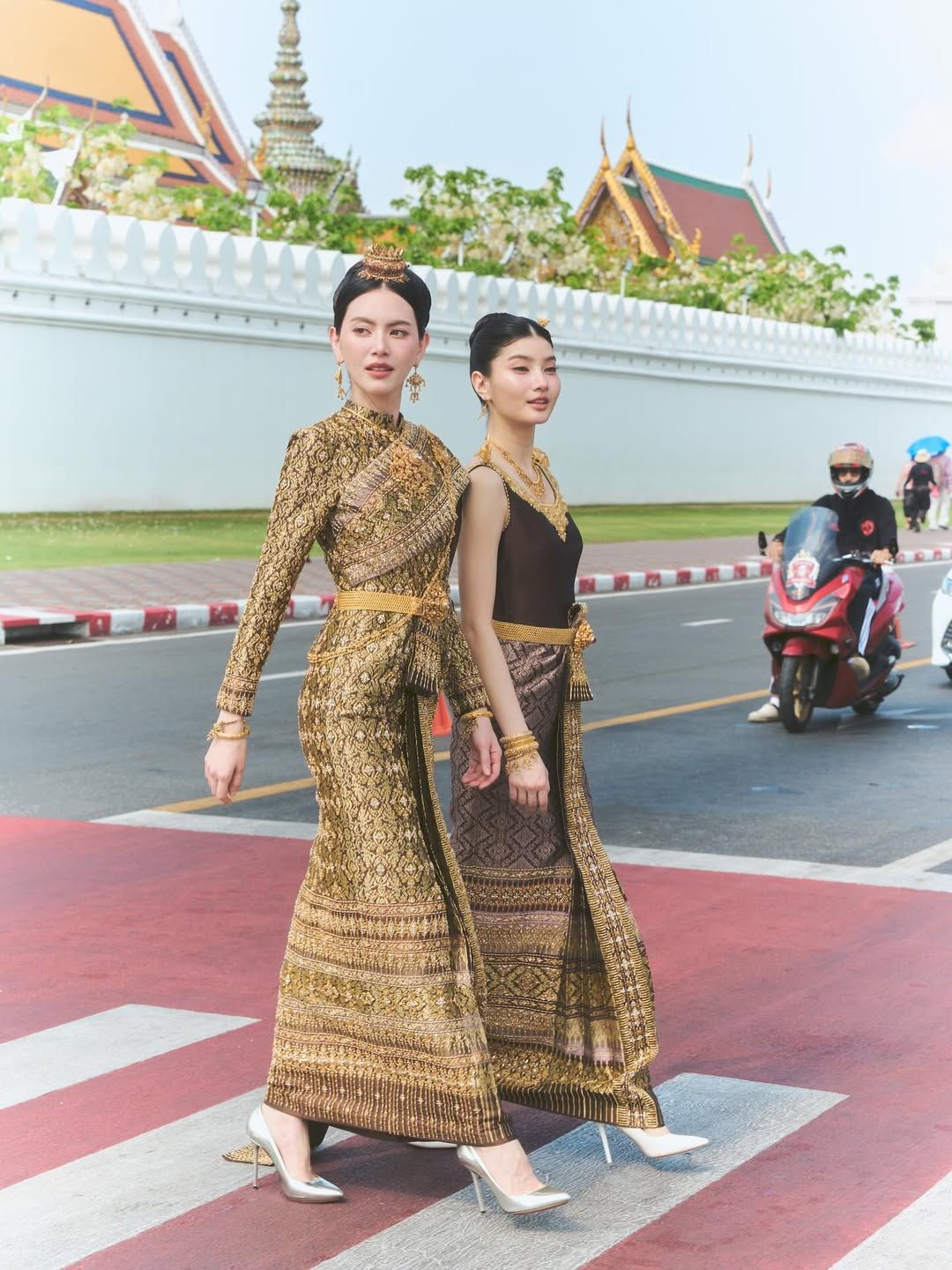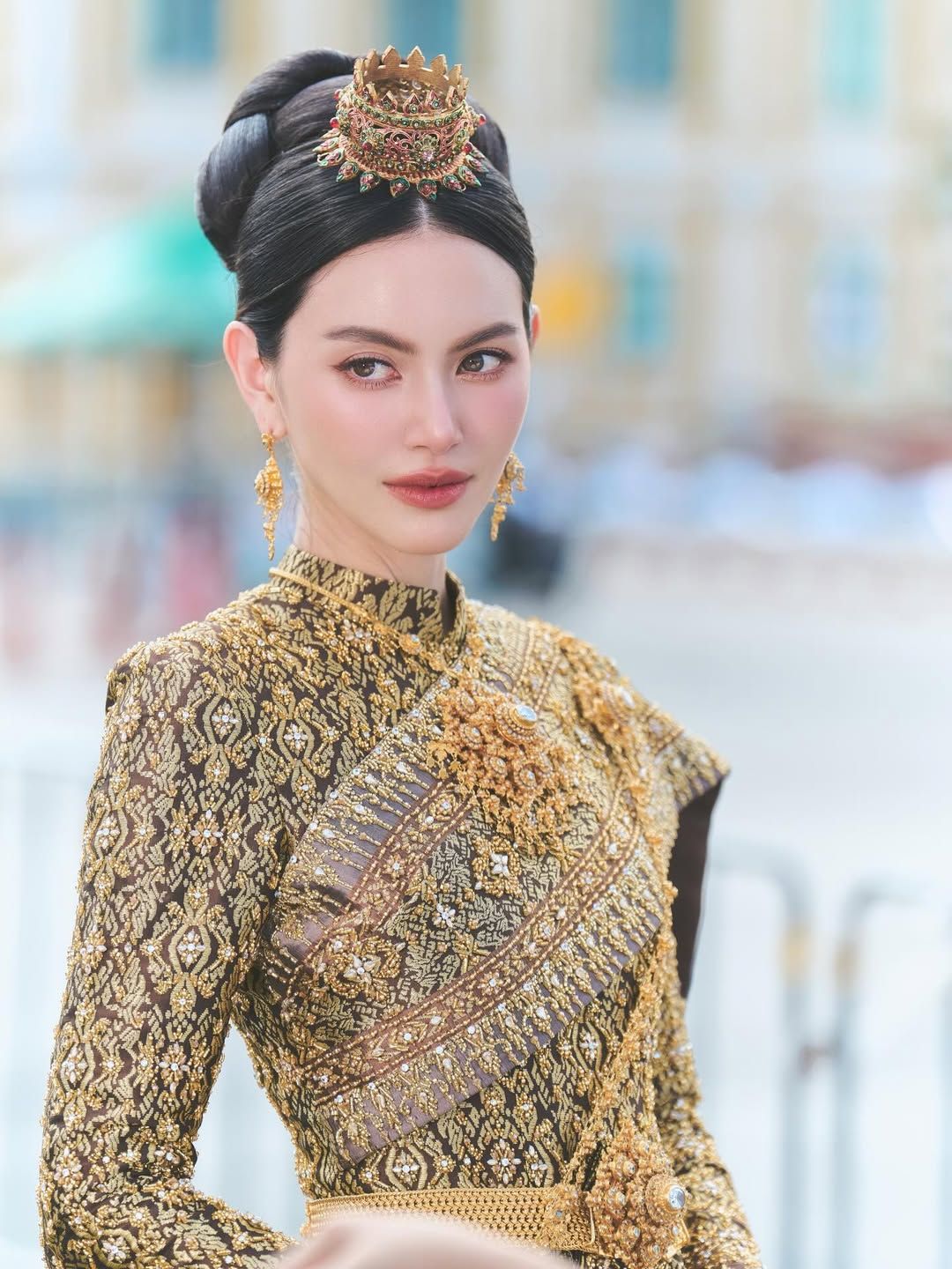 ลุคของ ใหม่ ดาวิกา โฮร์เน่ ในครั้งนี้โดดเด่นด้วยการเลือกใช้ผ้าไหมยกดอกลำพูนดิ้นทอง ซึ่งสั่งทอพิเศษถึง 4 ผืน นำมาตัดเย็บอย่างประณีต พร้อมประดับตกแต่งด้วยคริสตัลและองค์ประกอบโลหะที่สะท้อนแสงระยิบระยับ เพิ่มความหรูหราให้กับชุดได้อย่างลงตัว