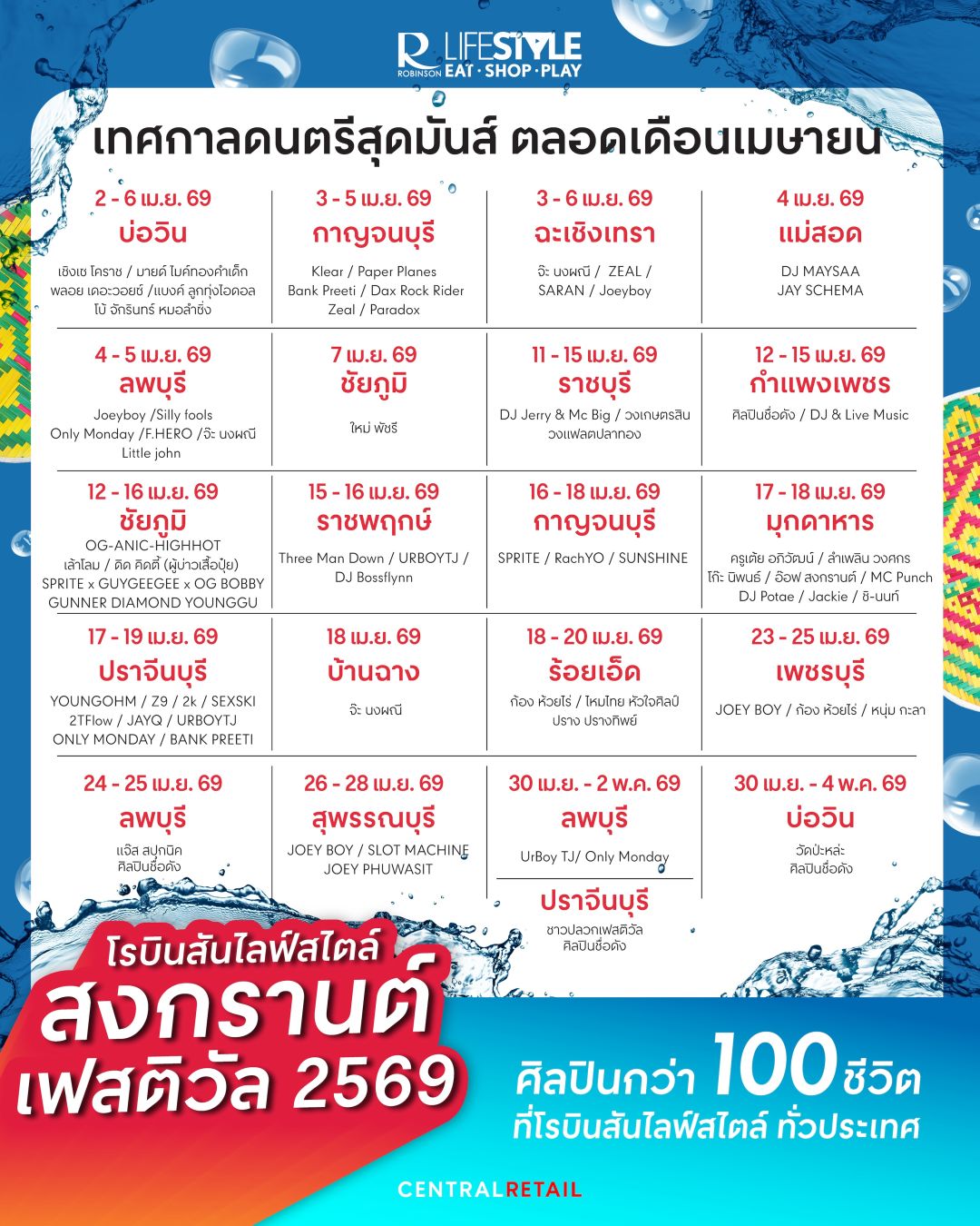 ศูนย์การค้าโรบินสันไลฟ์สไตล์ ในเครือเซ็นทรัล รีเทล ต้อนรับเทศกาลสงกรานต์ด้วยงาน “Summer Fest - Songkran Festival 2569” เทศกาลดนตรีและความบันเทิงครั้งใหญ่ทั่วไทย ที่เตรียมยกทัพศิลปินกว่า 100 ชีวิต มาร่วมสร้างสีสันและความสนุกตลอดเดือนเมษายน 2569 ณ โรบินสันไลฟ์สไตล์ ทั่วประเทศ เพื่อร่วมเฉลิมฉลองเทศกาลปีใหม่ไทยซึ่งเป็นช่วงเวลาแห่งความสุขของครอบครัว การกลับมาพบปะกันของคนใกล้ชิด และโมเมนต์แห่งความประทับใจที่มีความหมาย โดยโรบินสันไลฟ์สไตล์ยังคงตอกย้ำบทบาทในฐานะ “Central to Life” ศูนย์กลางชีวิตของทุกคน ผ่านการคัดสรรอิเวนต์ที่ตอบโจทย์ไลฟ์สไตล์อันหลากหลายของคนทุกเจเนเรชัน ทั้งสายดนตรี สายบันเทิง สายกิน และสายช้อป รวมไปถึงกลุ่มครอบครัวที่มองหาพื้นที่สำหรับพักผ่อนและใช้เวลาร่วมกันได้อย่างลงตัว พร้อมเนรมิตแต่ละสาขาให้กลายเป็นจุดหมายแห่งการเฉลิมฉลองที่เต็มไปด้วยบรรยากาศแห่งความสุข ความคึกคัก และประสบการณ์ความบันเทิงที่หลากหลาย ครอบคลุมทั้งแนวป๊อป ร็อก ฮิปฮอป ลูกทุ่ง ดีเจ และการแสดงสดอีกมากมาย ชวนทุกคนให้ออกมาร่วมสนุกและสัมผัสสีสันของสงกรานต์อย่างเต็มอิ่มตลอดทั้งเดือน