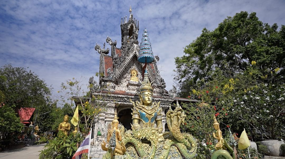 ความงดงามของวัดแห่งนี้อยู่ที่สถาปัตยกรรมที่ประดับประดาด้วยเปลือกหอยนานาชนิดอย่างประณีตทั่วทั้งพื้นที่ ไม่ว่าจะเป็นอุโบสถ หอระฆัง และมณฑปพระแก้วสามฤดู ที่สะกดทุกสายตาด้วยรายละเอียดอันวิจิตรบรรจง โดยเฉพาะลานหน้ามณฑปที่มีพระพุทธรูปปางไสยาสน์ตั้งเด่นอย่างสง่างาม