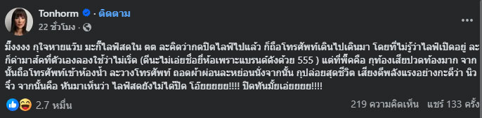โดยต้นหอมได้เล่าเหตุการณ์ผ่านเฟซบุ๊กไว้ว่า "มึ๊งงงง กุใจหายแว๊บ มะกี๊ไลฟ์สดใน ตต ละคิดว่ากดปิดไลฟ์ไปแล้ว ก็ถือโทรศัพท์เดินไปเดินมา โดยที่ไม่รู้ว่าไลฟ์เปิดอยู่ ละก็ด่ามาส์คที่ตัวเองลองใช้ว่าไม่เริ่ด (ดีนะไม่เอ่ยชื่อยี่ห้อเพราะแบรนด์ดังด้วย 555 ) แต่ที่พี๊คคือ กุท้องเสียปวดท้องมาก จากนั้นถือโทรศัพท์เข้าห้องน้ำ ละวางโทรศัพท์ ถอดผ้าผ่อนละหย่อนนั่งจากนั้น กุปล่อยสุดชีวิต เสียงดีพลังแรงอย่างกะดีว่า นิว จิ๋ว จากนั้นคือ หันมาเห็นว่า ไลฟ์สดยังไม่ได้ปิด โอ๊ยยยยย!!!! ปิดทันมั้ยเอ่ยยยย!!!!"