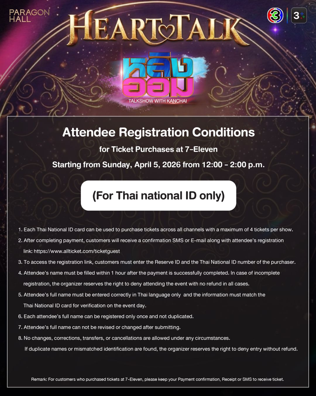-รอบผู้ที่ถือบัตรประชาชนไทย เริ่มจำหน่ายบัตร เวลา 12:00 – 14:00 น.(GMT+7) ที่เคาน์เตอร์เซอร์วิสในร้าน 7-Eleven ทุกสาขาทั่วประเทศไทย