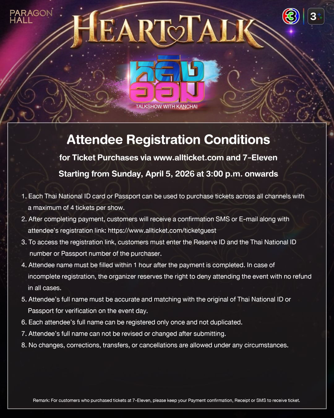 งานนี้รับรองว่าเข้มข้น ครบทุกอารมณ์ ทั้งโมเมนต์ฟิน โมเมนต์จริงใจ และเรื่องราวที่หลายคนอยากรู้ เตรียมสัมผัสด้วยตัวเองในวันเสาร์ที่ 25 เมษายน 2569 ณ พารากอน ฮอลล์ ชั้น 5 สยามพารากอน เริ่มจำหน่ายบัตรในวันอาทิตย์ที่ 5 เมษายน 2569 แบ่งออกเป็น 2 ช่วงเวลา ได้แก่
