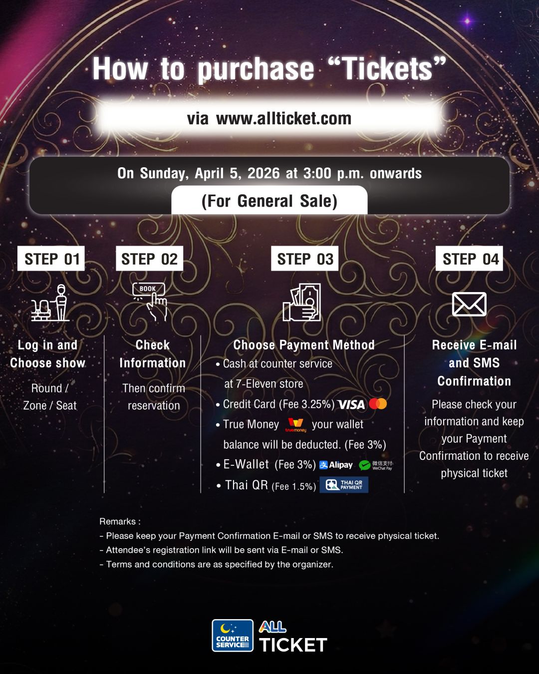 -รอบทั่วไป เริ่มจำหน่ายบัตร เวลา 15:00 น.(GMT+7) เป็นต้นไป ทางเว็บไซต์ Allticket รวมถึงเคาน์เตอร์เซอร์วิสในร้าน 7-Eleven ทุกสาขาทั่วประเทศไทย