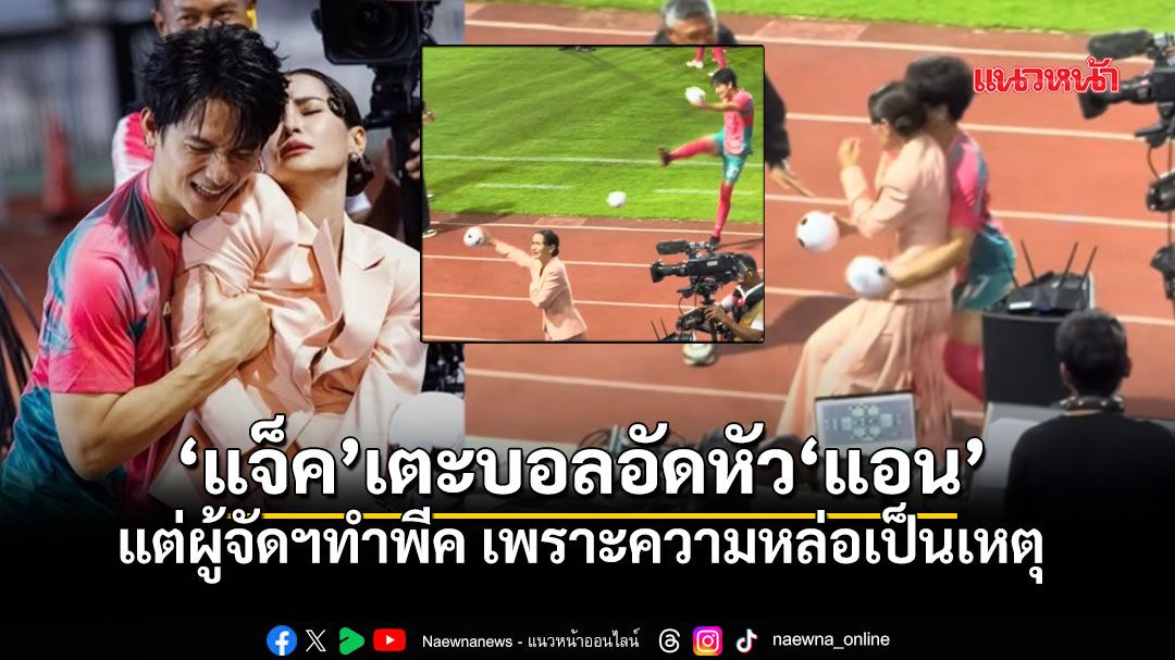 เหตุการณ์นี้ไม่ได้อยู่ในสคริปต์! เมื่อนักแสดงหนุ่ม “แจ็ค-จักรพันธ์” ตั้งใจจะโชว์ลีลาแข้งเหล็กเตะบอลแจกแฟนคลับตามธรรมเนียม แต่สงสัยจะตื่นเต้นไปหน่อยจนเสียหลัก กลายเป็นลูกบอลพุ่งตรงเข้าหาศีรษะพี่แอนแบบเต็มรัก! ทำเอาหนุ่มแจ็คหน้าถอดสีแบบ 0% รีบพุ่งเข้าไปไหว้ขอโทษขอโพยจนตัวสั่น