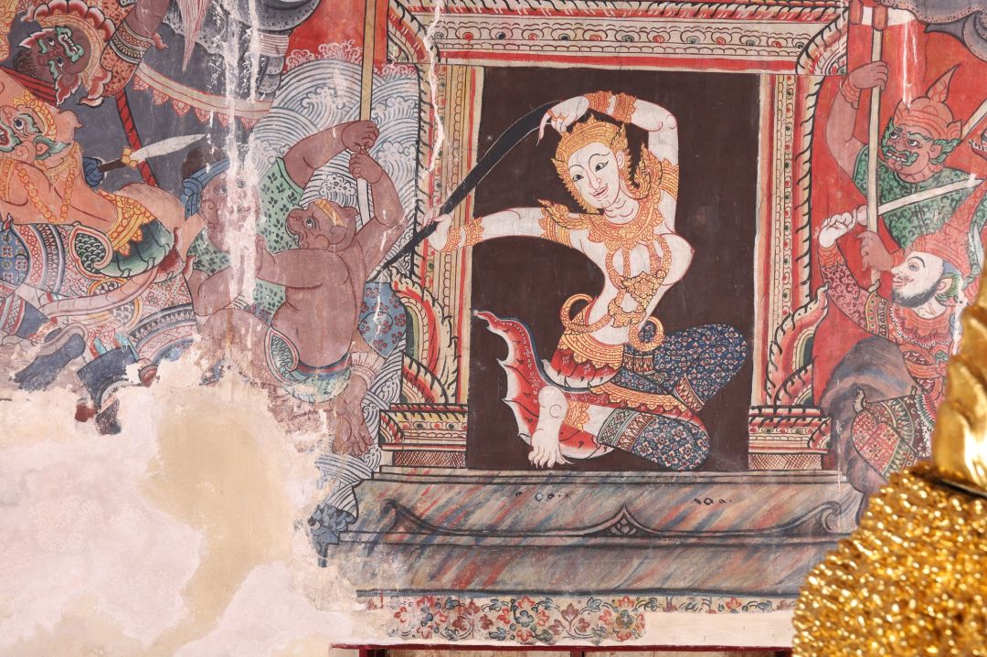 จิตรกรรม พระแม่ธรณีบีบมวยผม วัดชมภูเวก จ.นนทบุรี