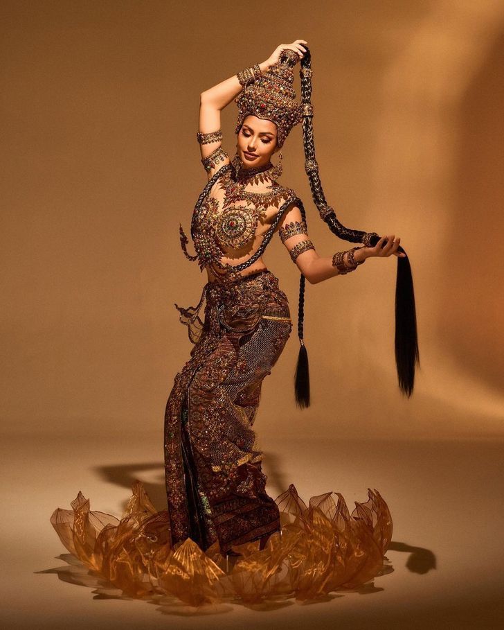 ในศิลปะพุทธ "มวยผม" เป็นทรงผมที่พบในรูปปั้นเทวีหรือนางในวรรณคดี ซึ่งอาจสื่อถึงความงามและพลังที่ซ่อนอยู่ ตามหนังสือ "ศิลปะไทย" โดยศาสตราจารย์ศิลป์ พีระศรี การบีบมวยผมอาจเป็นการแสดงถึงการปลดปล่อยพลังที่เก็บไว้ เหมือนน้ำที่ไหลออกมาเพื่อพิสูจน์ความจริงและขับไล่ศัตรู
