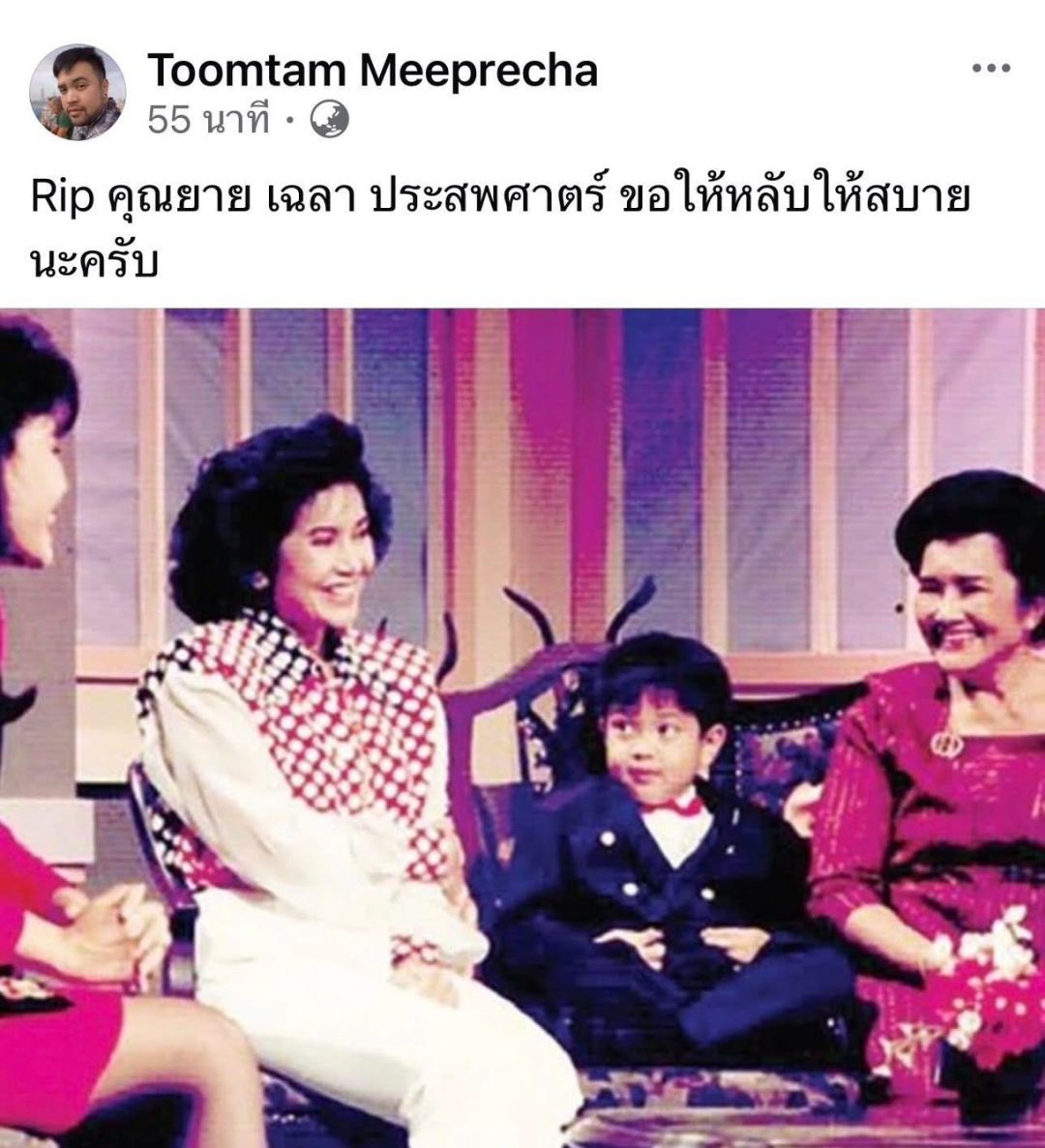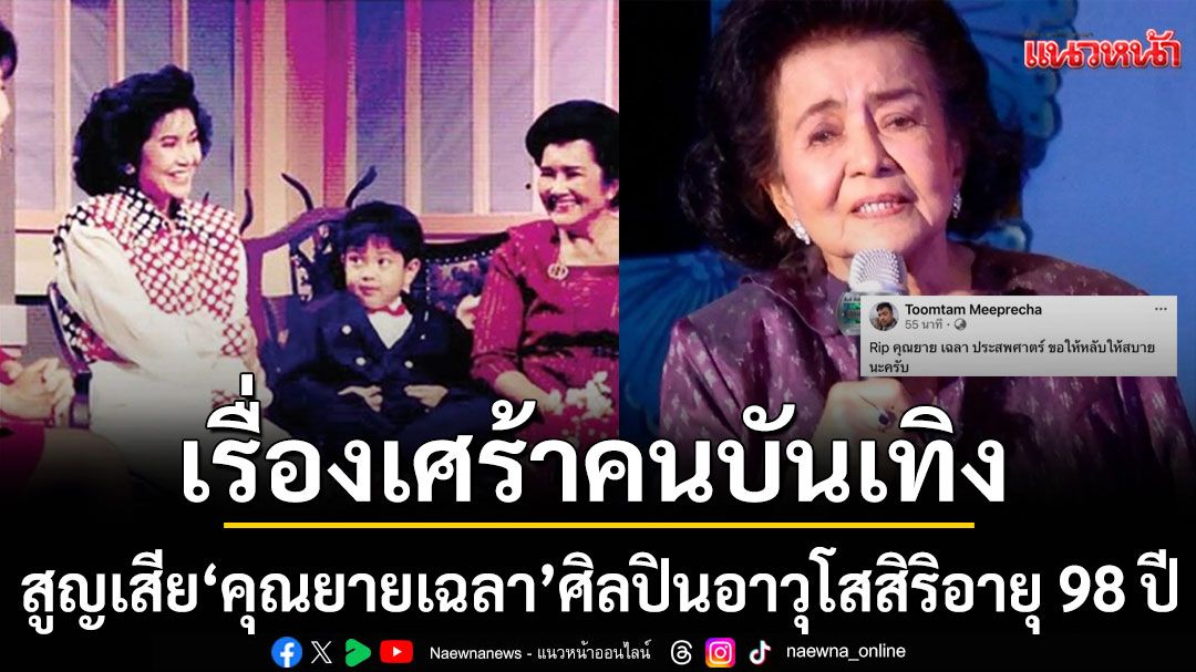 วงการบันเทิงไทยสูญเสียหนึ่งในบุคคลสำคัญที่เป็นที่รักของคนบันเทิง คุณยายเฉลา ประสพศาสตร์ จากไปอย่างสงบด้วยโรคชรา (6 เมษายน 2569) สิริอายุ98ปีโดยเฟสบุคของ toomtammeeprecha หรือ ตูมตาม อดีตดาราเด็กคนดัง โพสต์ข่าวเศร้าว่าRip คุณยาย เฉลา ประสพศาตร์ ขอให้คุณยายนอนหลับสบายนะครับ ขอบคุณที่สอนสิ่งต่างๆมานะครับ