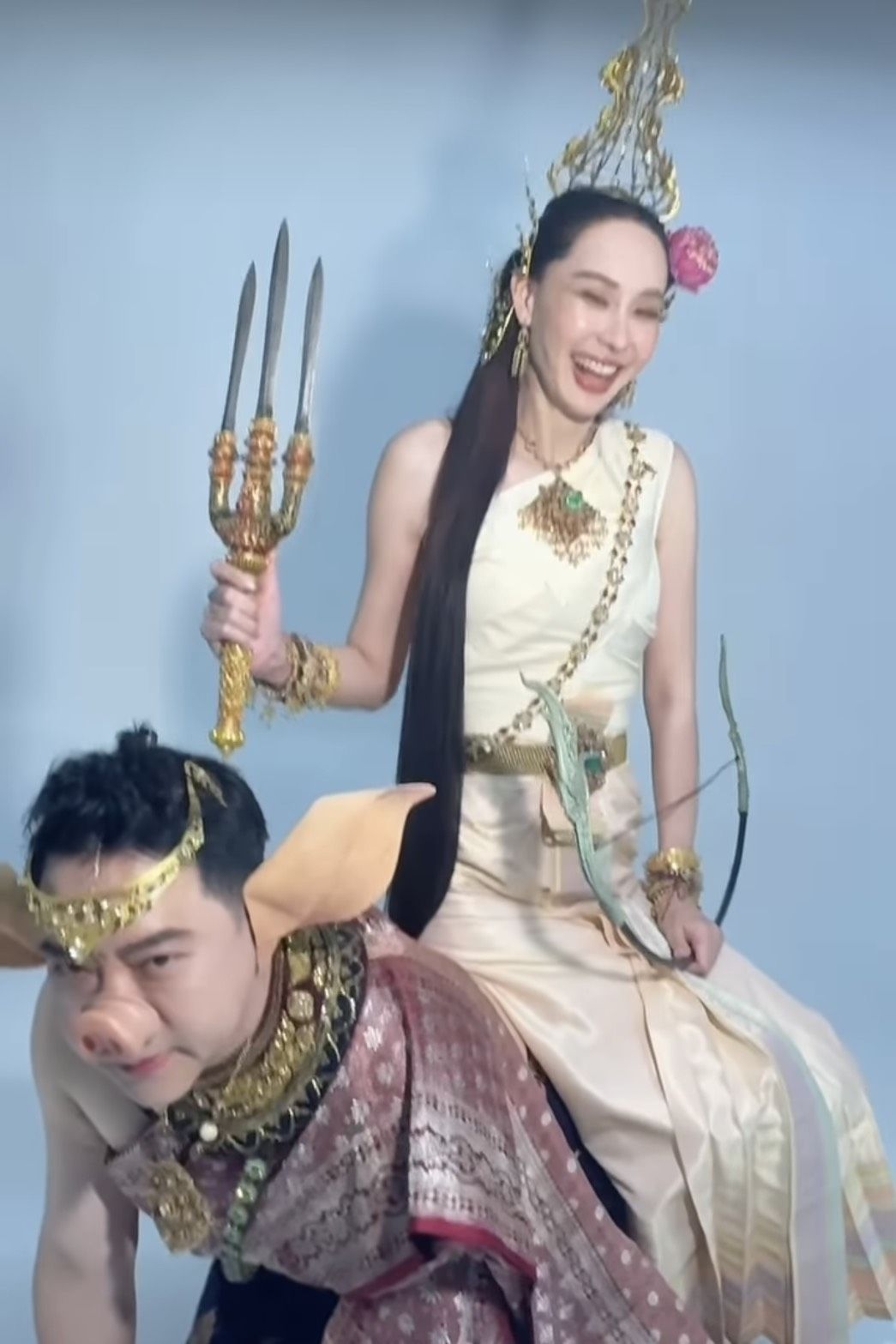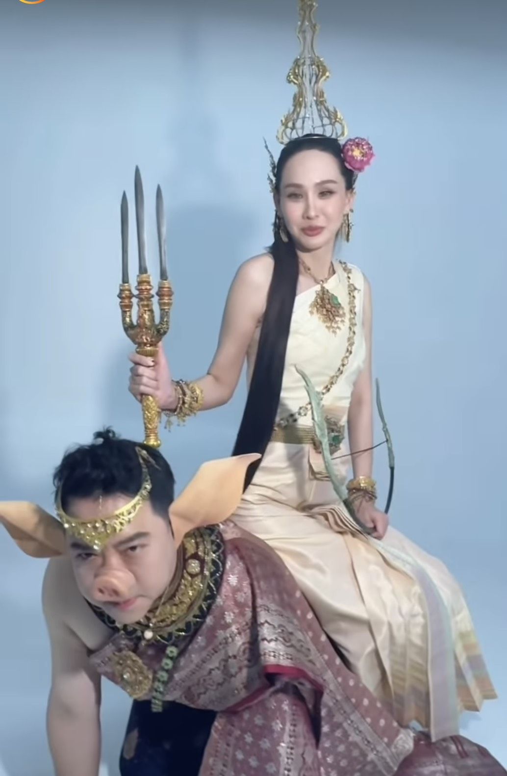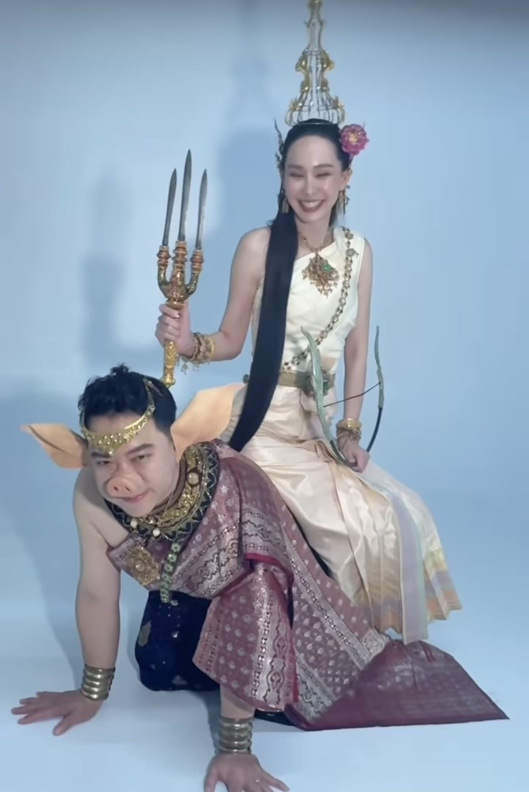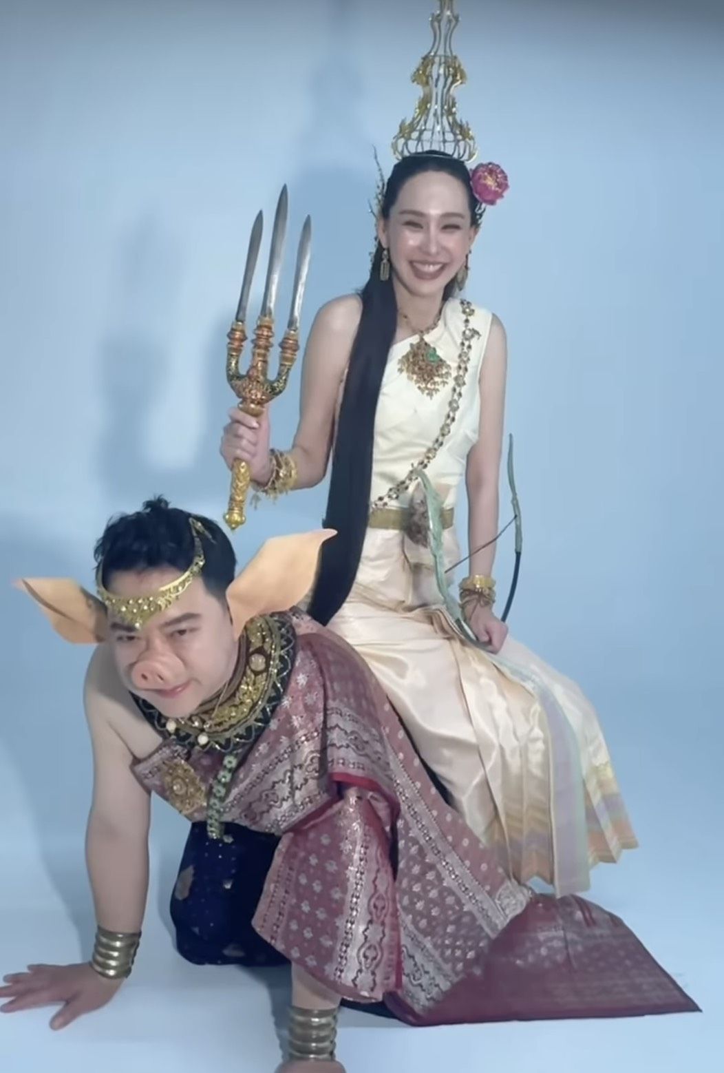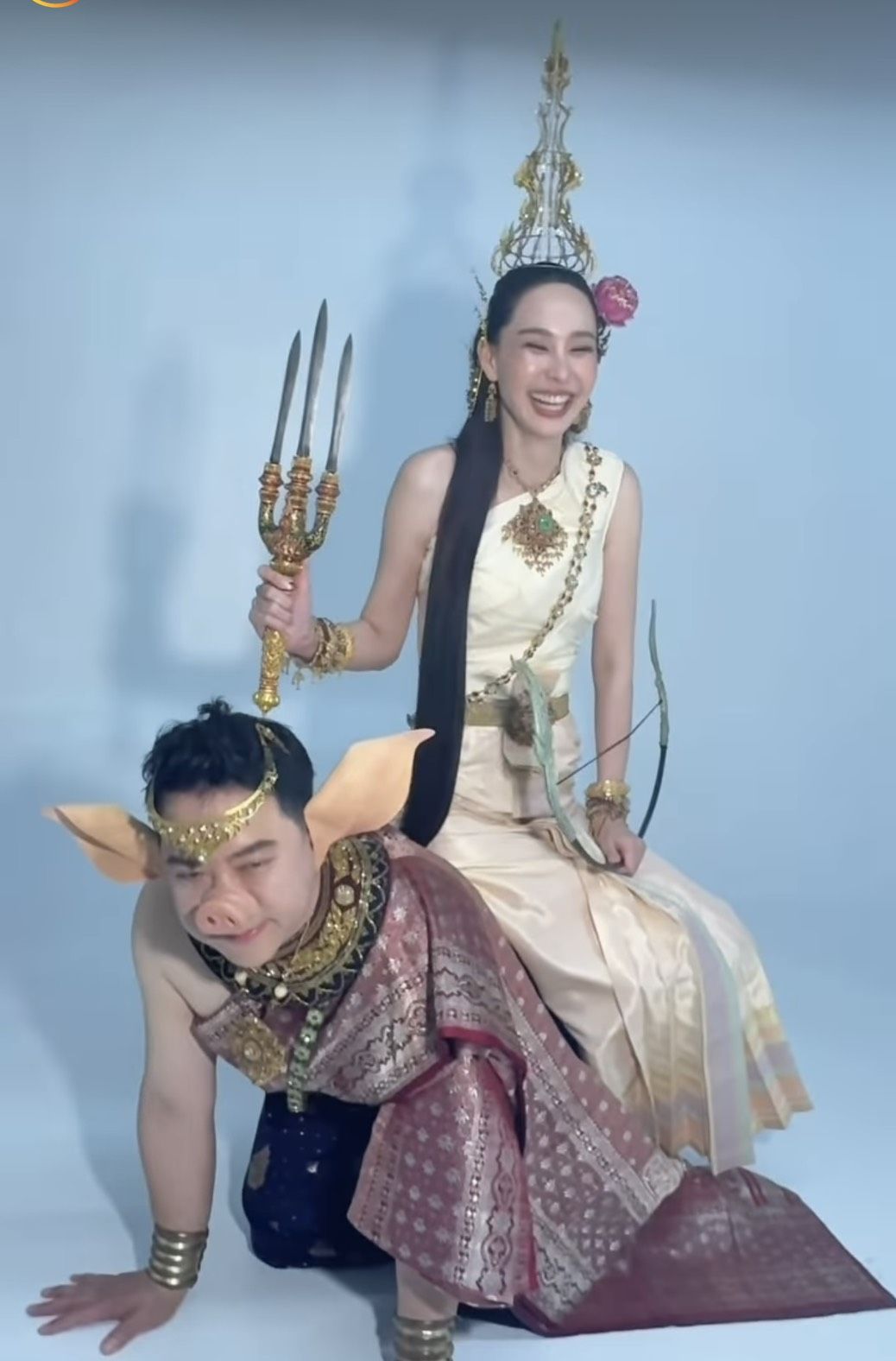 ในภาพปรากฏให้เห็น นุ้ย สุจิรา สวมชุดไทยโบราณสีนวลอร่าม เครื่องโขนเครื่องประดับจัดเต็ม พร้อมถืออาวุธและคันธนูตามลักษณะนางสงกรานต์ประจำปี แต่ที่ดึงดูดสายตาสุดๆ จนหลุดโฟกัสคือพาหนะข้างกายที่ไม่ใช่สัตว์ในตำนานที่ไหน แต่เป็นคุณสามีสุดที่รัก "ปอนด์ - ชยพล หลีระพันธ์" ที่ยอมทุ่มสุดตัว แปลงกายใส่จมูกหมูและหูปลอม ลงไปคุกเข่ารับบทเป็นพาหนะให้ภรรยาสาวขี่หลังถ่ายภาพอย่างอารมณ์ดี งานนี้ทำเอาแฟนคลับและเพื่อนพ้องในวงการบันเทิงแห่กันเข้ามาคอมเมนต์แซวกันยกใหญ่ ถึงความยอมเมียของคุณปอนด์ ที่ไม่ว่าจะโปรเจกต์ไหน หรือคอนเทนต์จะหลุดโลกเพียงใด สามีคนนี้ก็พร้อมซัพพอร์ตและร่วมเฟรมด้วยทุกครั้ง จนหลายคนยกตำแหน่ง "สามีดีเด่น" ให้ไปครองแบบไม่มีคู่แข่ง