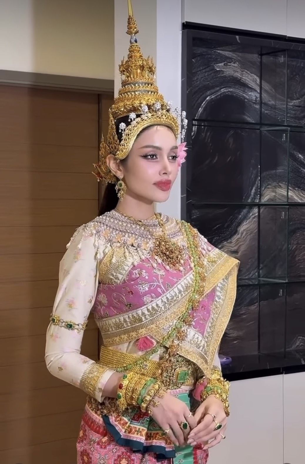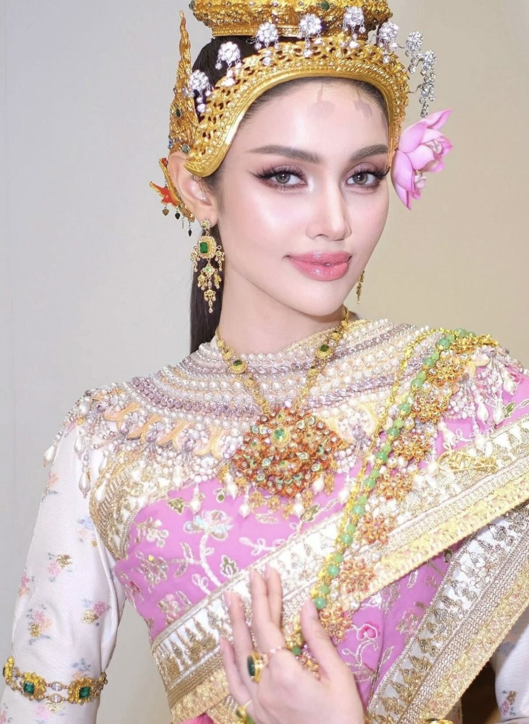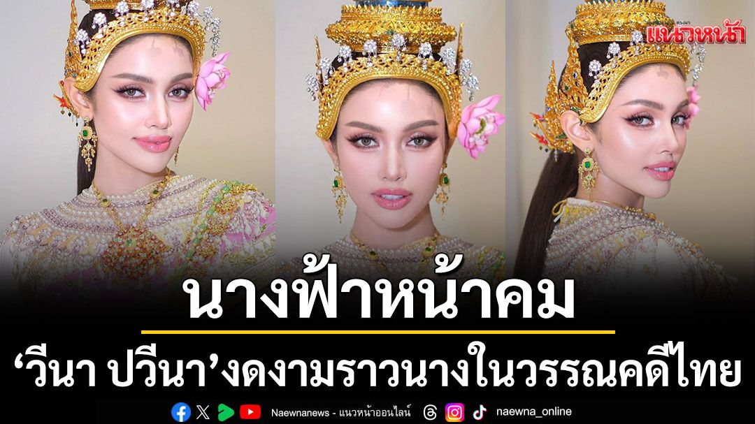ในลุคนี้วีนามาในชุดไทยที่ผสมผสานความอ่อนหวานและความหรูหราได้อย่างลงตัวสไบและผ้าซิ่น: โดดเด่นด้วยโทนสีชมพูบานเย็นตัดกับผ้าถุงลายไทยสีเขียวมรกตและแดง สลักเสลาลวดลายพรรณพฤกษาอย่างละเอียดลออเต็มด้วยงานประณีตศิลป์ ทั้ง ศิราภรณ์ (ชฎา) ทรงสูงสีทองอร่ามประดับอัญมณี สวมทับบนมวยผมที่ประดับด้วยดอกบัวสีชมพูสด เพิ่มความอ่อนโยนให้กับใบหน้าเสริมความสง่าด้วยเครื่องทองครบชุด ทั้งปั้นเหน่ง (หัวเข็มขัด) ขนาดใหญ่ประดับหินสีเขียว, สร้อยสังวาลย์, และกำไลข้อมือทองคำสลักลายออร่าที่มากกว่าความสวยไม่ใช่แค่ชุดที่ส่งเสริม แต่ด้วยอินเนอร์และการโพสท่าที่ดูนิ่ง สงบ แต่ทรงพลังของวีนา ทำให้ลุคนี้ดูขลังและเปี่ยมไปด้วยเสน่ห์ของหญิงไทยสมัยใหม่ที่ยังคงรักษารากเหง้าทางวัฒนธรรมได้อย่างน่าชื่นชมงานนี้ทำเอาเหล่าแฟนคลับและแฟนนางงามต่างเข้ามาคอมเมนต์ชื่นชมในความ "สวยสร้างเรื่อง" และยกให้เป็นอีกหนึ่งลุคชุดไทยที่ดีที่สุดของเธอในปีนี้เลยทีเดียว