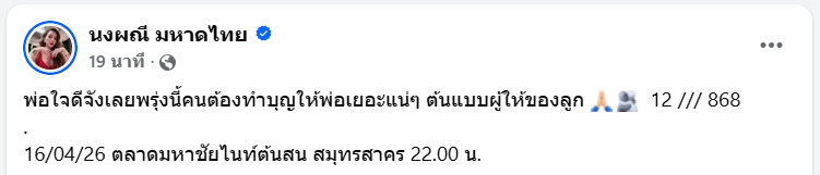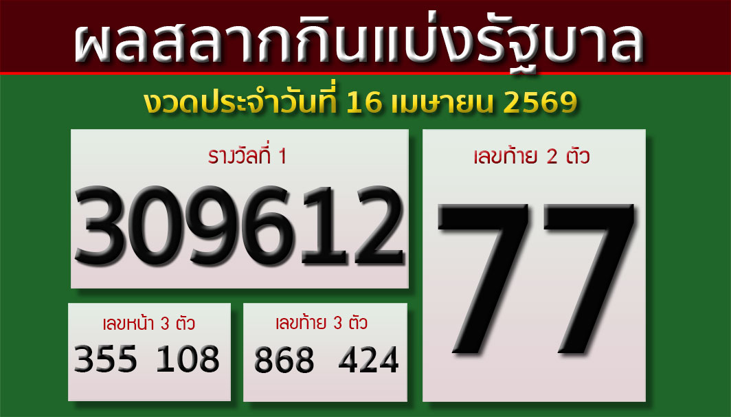 กลายเป็นเรื่องฮือฮาหลังผลการออกสลากกินแบ่งรัฐบาล งวดประจำวันที่ 16 เมษายน 2569 ประกาศออกมา โดยรางวัลที่ 1 ได้แก่หมายเลข 309612 ซึ่งตรงกับเลขเด็ดที่แฟนคลับจับตามองจากโพสต์ของนักร้องสาวชื่อดัง "จ๊ะ นงผณี มหาดไทย" หรือ จ๊ะ อาร์สยาม