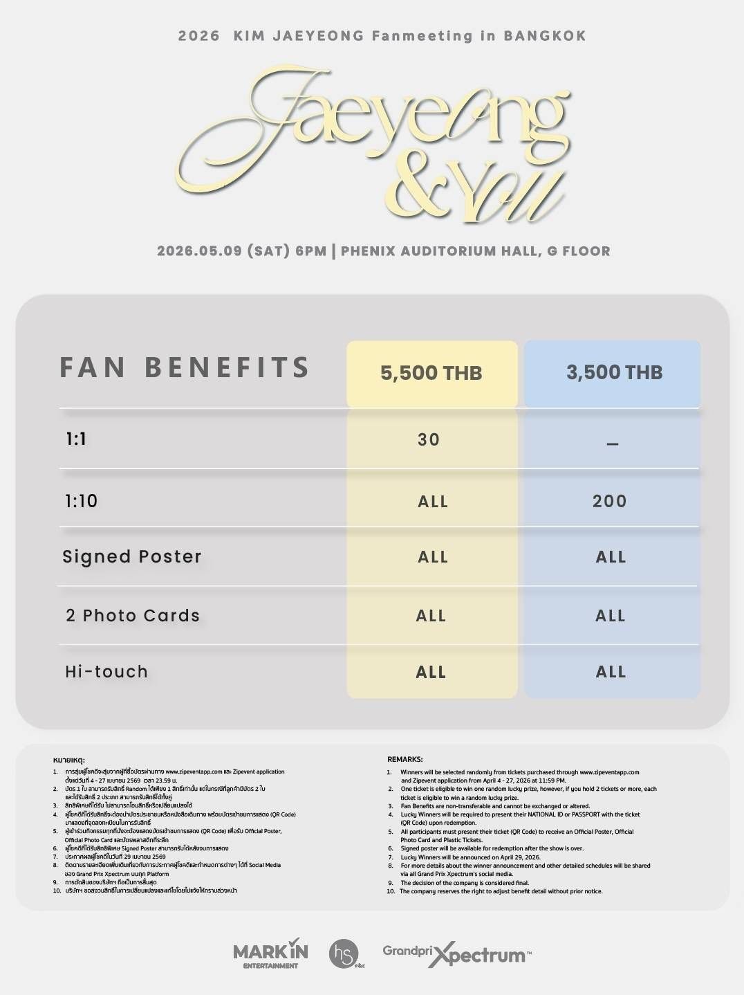 ปักหมุดความฟิน: วันเสาร์ที่ 9 พฤษภาคม 2569 ณ PHENIX Auditorium Hall บัตรราคา 5,500 / 3,500 บาท พร้อม Fan Benefits แบบจัดเต็มทุกที่นั่ง: Hi-touch, โปสเตอร์, โฟโต้การ์ด และของที่ระลึกสุดพิเศษ แถมลุ้นสิทธิ์ใกล้ชิดระดับ 1:1 สำหรับผู้ถือบัตร 5,500 บาท