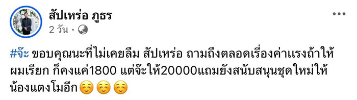 โดยในโพสต์ดังกล่าวระบุว่า โดยด้านผู้ใช้เฟซบุ๊ก สัปเหร่อ ภูธร ได้โพสต์ภาพคู่กับสาวจ๊ะและข้อความที่ระบุถึงความประทับใจในครั้งนี้ว่า “#จ๊ะ ขอบคุณนะที่ไม่เคยลืม สัปเหร่อ ถามถึงตลอดเรี่องค่าแรงถ้าให้ผมเรียก ก็คงแค่ 1800 แต่จ๊ะให้ 20000 แถมยังสนับสนุนชุดใหม่ให้น้องแตงโมอีก”