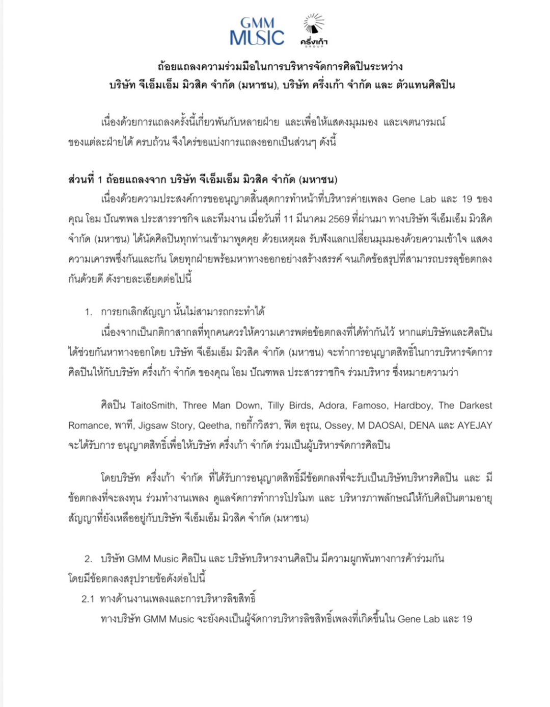 ของแต่ละฝ่ายได้ ครบถ้วน จึงใคร่ขอแบ่งการแถลงออกเป็นส่วนๆ โดยมีภาวิต จิตรกร ประธานเจ้าหน้าที่บริหาร บริษัท จีเอ็มเอ็ม มิวสิค จำกัด(มหาชน),,โอม ปัณฑพล ประสารราชกิจ ตัวแทนกลุ่มผู้บริหารบริษัท ครึ่งเก้า จำกัด,กฤตย์ จีรพัฒนานุวงศ์ ตัวแทน วง Three Man Down ,ณัฐดนัย ชูชาติ ตัวแทนวง Tilly Birds ,อิชณน์กร พึ่งเกียรติรัศมี ตัวแทนวง Taitosmith ร่วมแถลง โดยมีใจความว่า