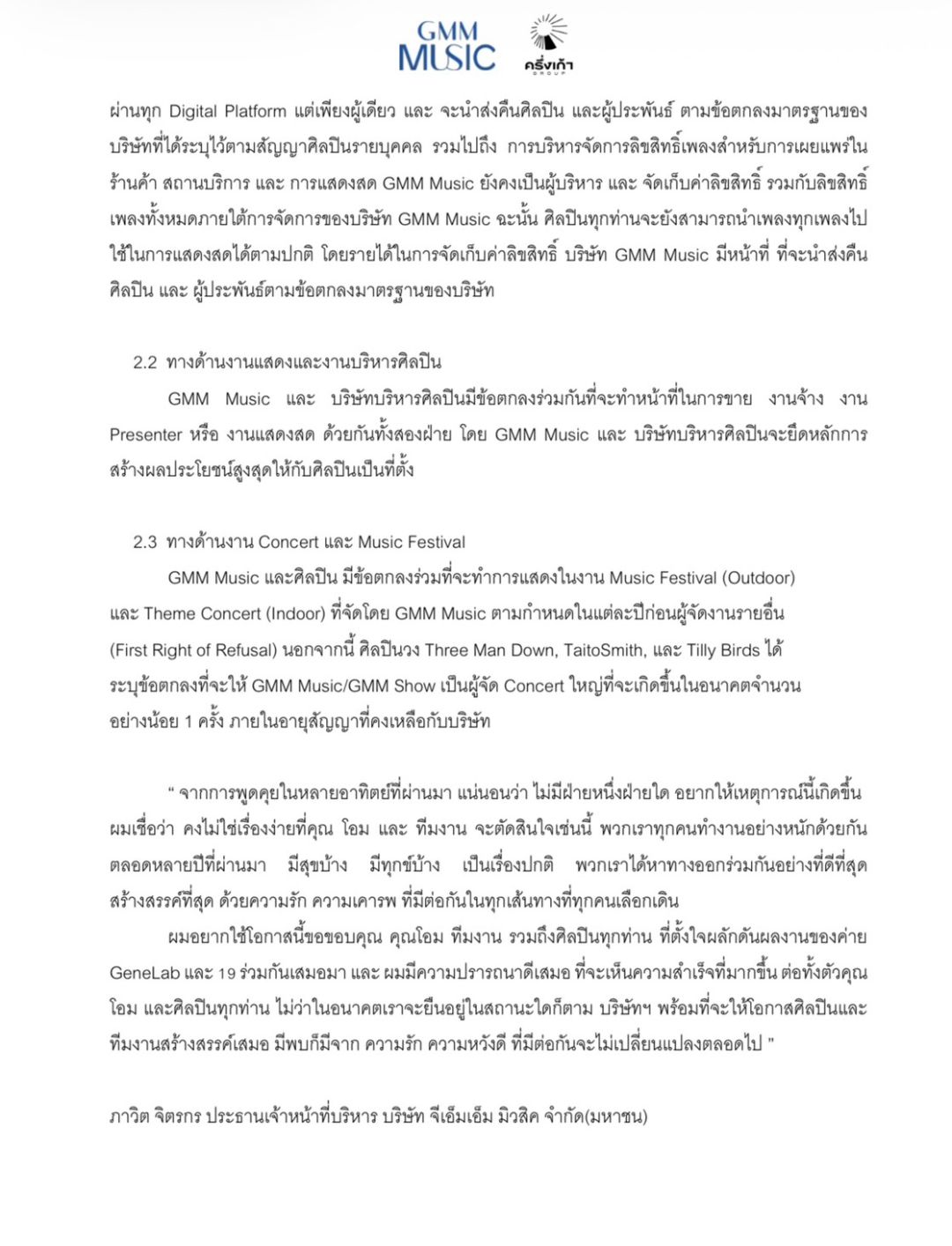 ตลอดระยะเวลาที่ผ่านมาคุณภาวิต คุณฟ้าใหม่ รวมถึงทีมงานอื่นๆของ GMM Music ทุกภาคส่วนได้กรุณาผมทั้งในฐานะศิลปินและในฐานะผู้รับจ้าง รวมถึงศิลปินในการดูแลรับผิดชอบของผมอย่างพิถีพิถันเสมอมา การเดินทางออกจากบ้านหลังแรกและหลังเดียวในช่วงชีวิตเป็นการตัดสินใจที่ยากลำบากยิ่ง และแม้หลังจากได้ตัดสินใจลงไปแล้วในช่วงเวลาของการอำลา ผมและบุคลากรก็ยังได้รับการสนับสนุนและคำอวยพรจากผู้บริหารหลายท่านในการเติบโตต่อไป ซึ่งผมซาบซึ้งอย่างยิ่ง และขอยืนยันว่าการทำงานของเราต่อไปในอนาคตแม้ว่าจุดเริ่มต้นของการลาจากกันไปคือการแยกย้ายไปเติบโตตามความเชื่อในรูปแบบการทำงาน แต่ผมจะยังคงทำงานสนับสนุน และให้เกียรติบ้านหลังนี้เสมอ