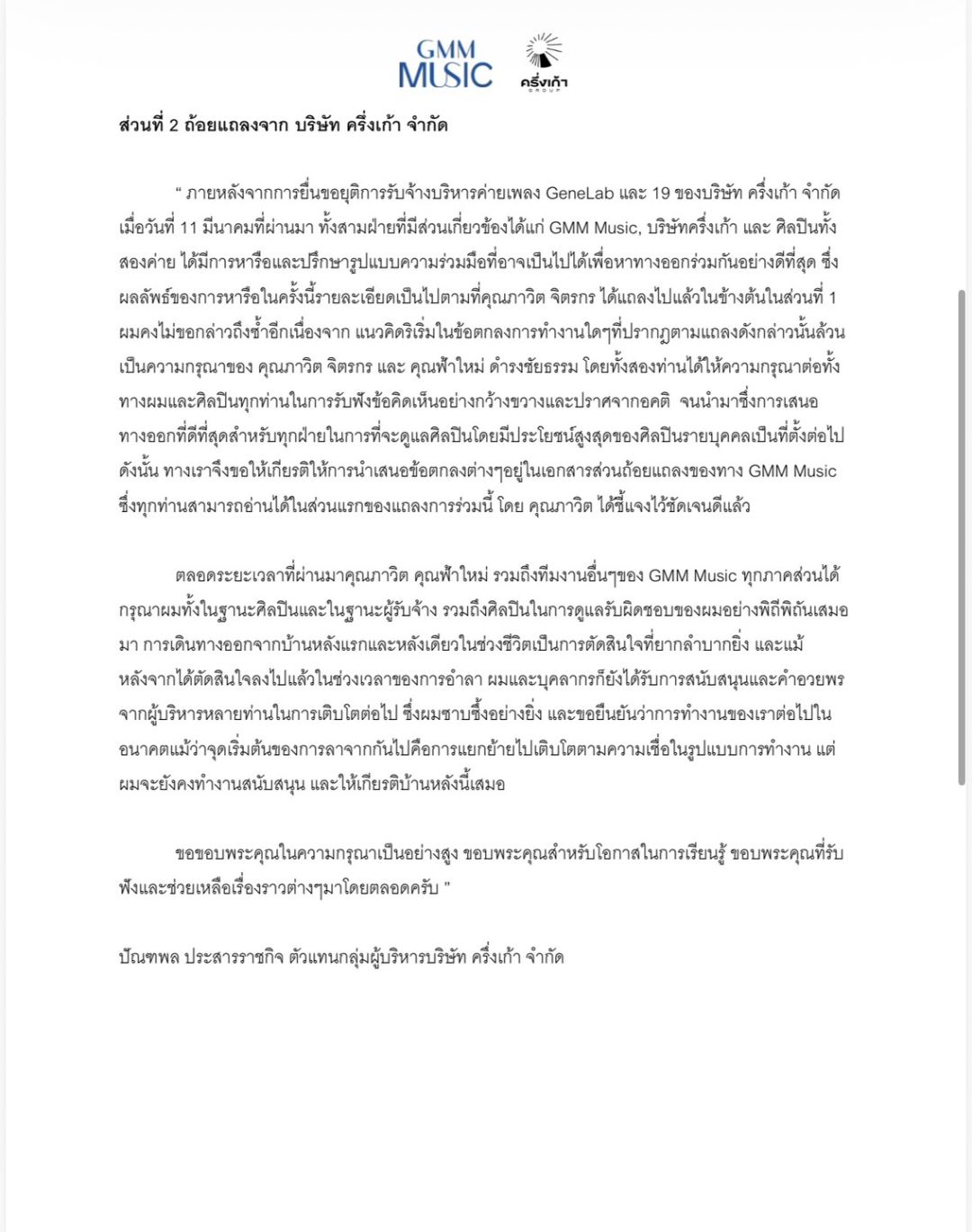 “ ภายหลังจากการยื่นขอยุติการรับจ้างบริหารค่ายเพลง GeneLab และ 19 ของบริษัท ครึ่งเก้า จำกัด เมื่อวันที่ 11 มีนาคมที่ผ่านมา ทั้งสามฝ่ายที่มีส่วนเกี่ยวข้องได้แก่ GMM Music, บริษัทครึ่งเก้า และ ศิลปินทั้งสองค่าย ได้มีการหารือและปรึกษารูปแบบความร่วมมือที่อาจเป็นไปได้เพื่อหาทางออกร่วมกันอย่างดีที่สุด ซึ่งผลลัพธ์ของการหารือในครั้งนี้รายละเอียดเป็นไปตามที่คุณภาวิต จิตรกร ได้แถลงไปแล้วในข้างต้นในส่วนที่ 1 ผมคงไม่ขอกล่าวถึงซ้ำอีกเนื่องจาก แนวคิดริเริ่มในข้อตกลงการทำงานใดๆที่ปรากฎตามแถลงดังกล่าวนั้นล้วนเป็นความกรุณาของ คุณภาวิต จิตรกร และ คุณฟ้าใหม่ ดำรงชัยธรรม โดยทั้งสองท่านได้ให้ความกรุณาต่อทั้งทางผมและศิลปินทุกท่านในการรับฟังข้อคิดเห็นอย่างกว้างขวางและปราศจากอคติ จนนำมาซึ่งการเสนอทางออกที่ดีที่สุดสำหรับทุกฝ่ายในการที่จะดูแลศิลปินโดยมีประโยชน์สูงสุดของศิลปินรายบุคคลเป็นที่ตั้งต่อไป ดังนั้น ทางเราจึงขอให้เกียรติให้การนำเสนอข้อตกลงต่างๆอยู่ในเอกสารส่วนถ้อยแถลงของทาง GMM Music ซึ่งทุกท่านสามารถอ่านได้ในส่วนแรกของแถลงการร่วมนี้ โดย คุณภาวิต ได้ชี้แจงไว้ชัดเจนดีแล้ว