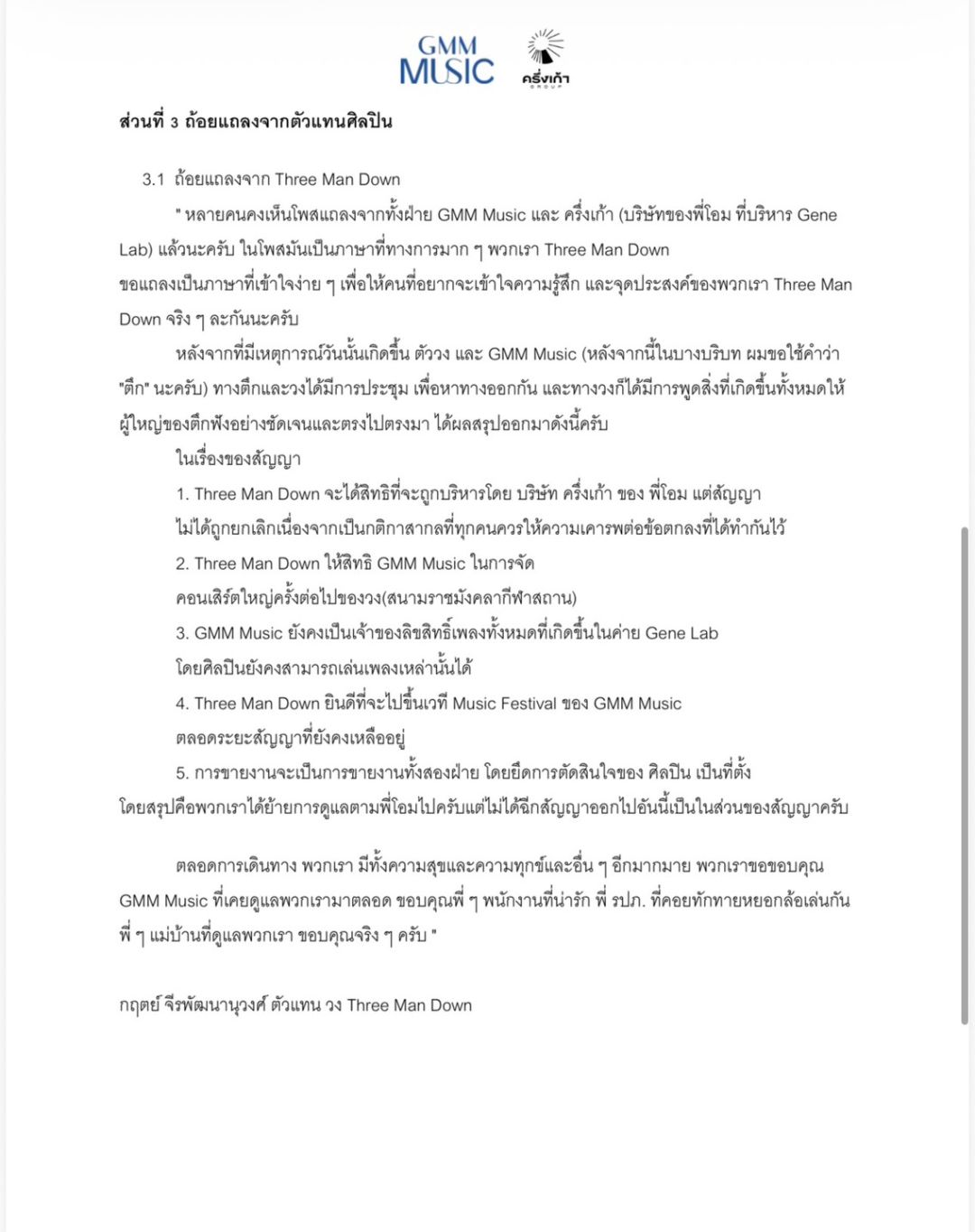" หลายคนคงเห็นโพสแถลงจากทั้งฝ่าย GMM Music และ ครึ่งเก้า (บริษัทของพี่โอม ที่บริหาร Gene Lab) แล้วนะครับ ในโพสมันเป็นภาษาที่ทางการมาก ๆ พวกเรา Three Man Down ขอแถลงเป็นภาษาที่เข้าใจง่าย ๆ เพื่อให้คนที่อยากจะเข้าใจความรู้สึก และจุดประสงค์ของพวกเรา Three Man Down จริง ๆ ละกันนะครับ