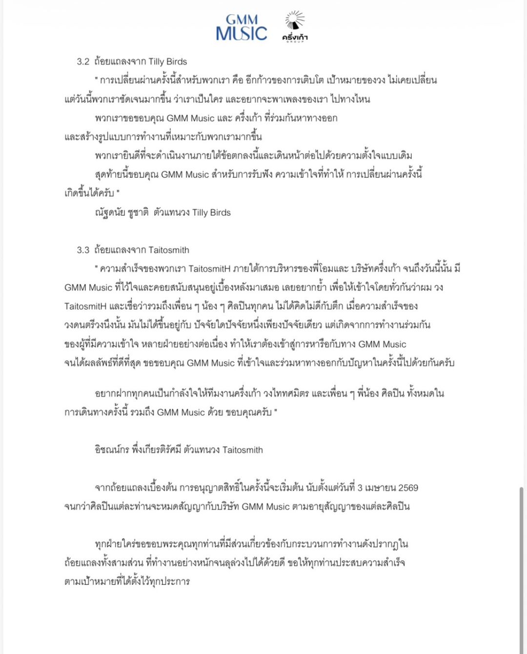 " ความสําเร็จของพวกเรา TaitosmitH ภายใต้การบริหารของพี่โอมและ บริษัทครึ่งเก้า จนถึงวันนี้นั้น มี GMM Music ที่ไว้ใจและคอยสนับสนุนอยู่เบื้องหลังมาเสมอ เลยอยากย้ำ เพื่อให้เข้าใจโดยทั่วกันว่าผม วง TaitosmitH และเชื่อว่ารวมถึงเพื่อน ๆ น้อง ๆ ศิลปินทุกคน ไม่ได้คิดไม่ดีกับตึก เมื่อความสําเร็จของ วงดนตรีวงนึงนั้น มันไม่ได้ขึ้นอยู่กับ ปัจจัยใดปัจจัยหนึ่งเพียงปัจจัยเดียว แต่เกิดจากการทํางานร่วมกัน ของผู้ที่มีความเข้าใจ หลายฝ่ายอย่างต่อเนื่อง ทําให้เราต้องเข้าสู่การหารือกับทาง GMM Music จนได้ผลลัพธ์ที่ดีที่สุด ขอขอบคุณ GMM Music ที่เข้าใจและร่วมหาทางออกกับปัญหาในครั้งนี้ไปด้วยกันครับ