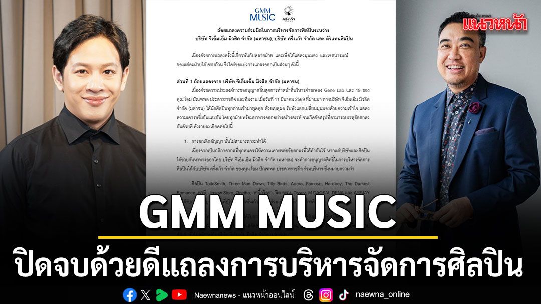 เนื่องด้วยความประสงค์การขออนุญาตสิ้นสุดการทำหน้าที่บริหารค่ายเพลง Gene Lab และ 19 ของคุณ โอม ปัณฑพล ประสารราชกิจ และทีมงาน เมื่อวันที่ 11 มีนาคม 2569 ที่ผ่านมา ทางบริษัท จีเอ็มเอ็ม มิวสิค จำกัด (มหาชน) ได้นัดศิลปินทุกท่านเข้ามาพูดคุย ด้วยเหตุผล รับฟังแลกเปลี่ยนมุมมองด้วยความเข้าใจ แสดงความเคารพซึ่งกันและกัน โดยทุกฝ่ายพร้อมหาทางออกอย่างสร้างสรรค์ จนเกิดข้อสรุปที่สามารถบรรลุข้อตกลงกันด้วยดี ดังรายละเอียดต่อไปนี้