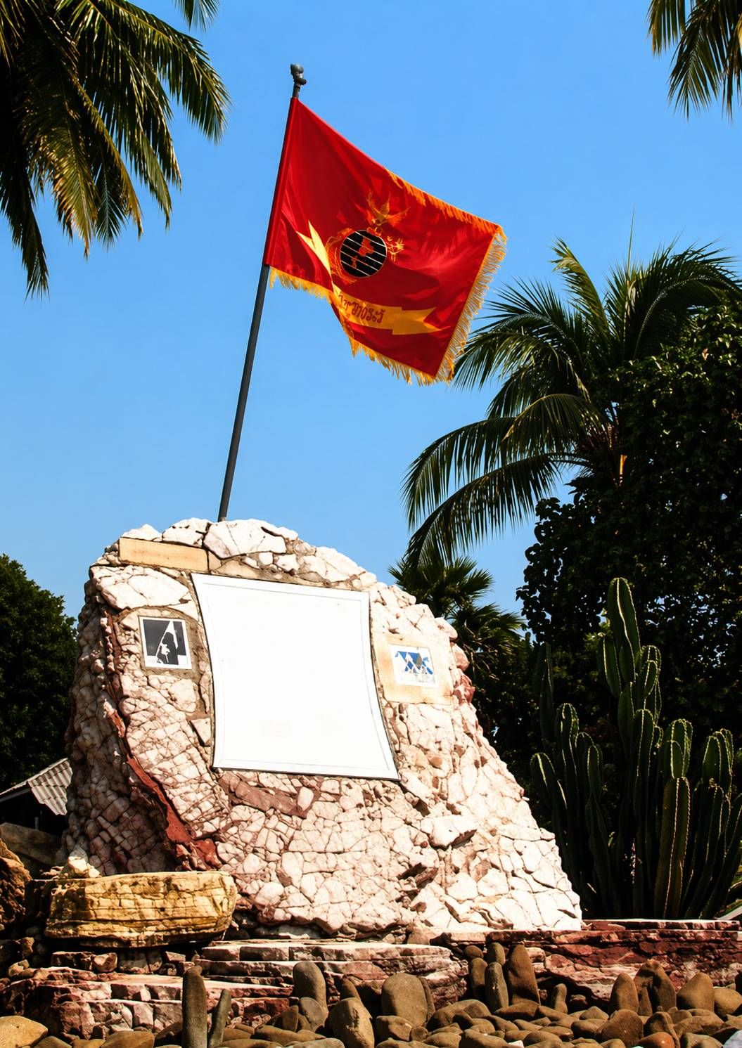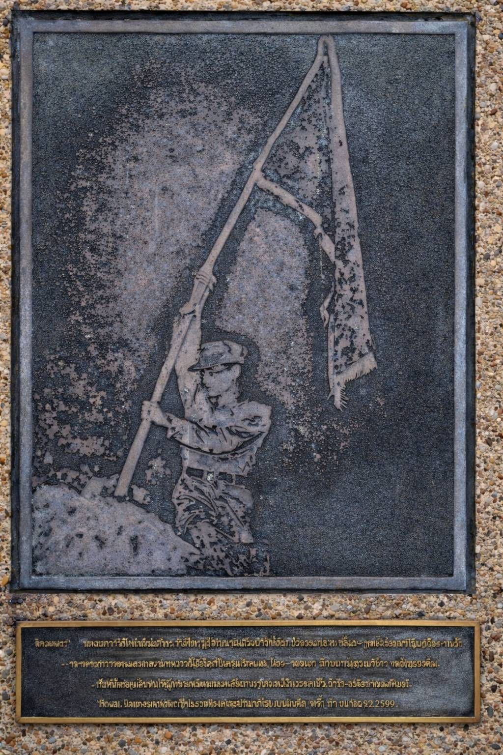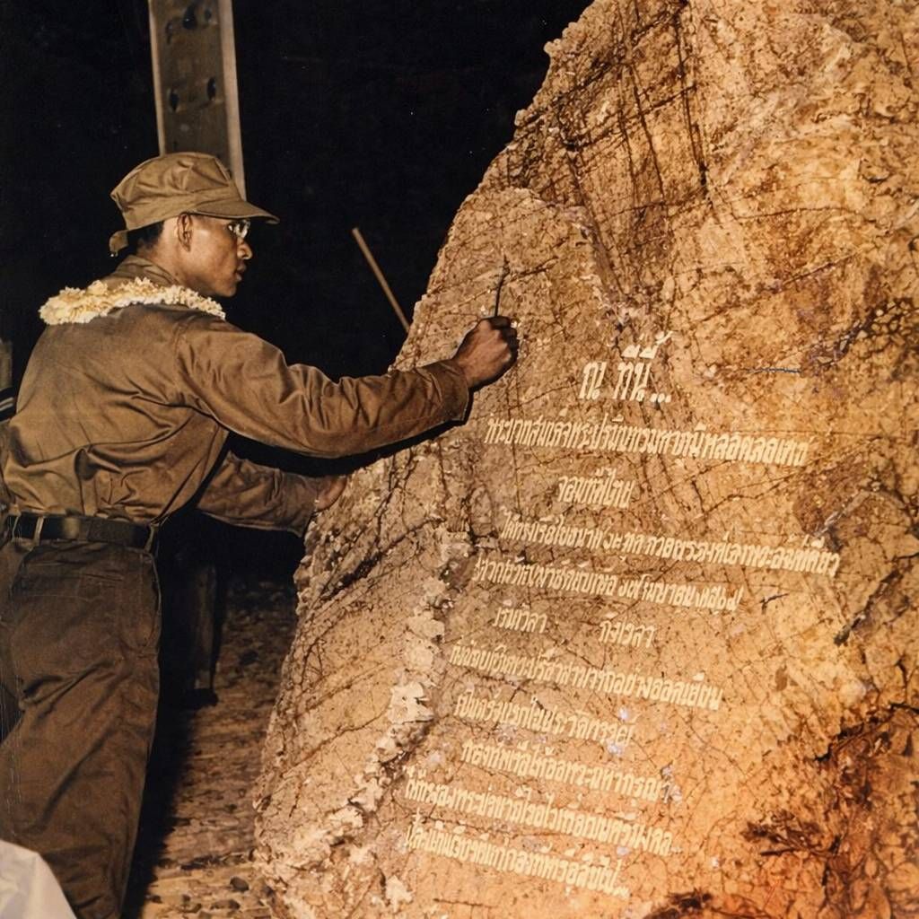 เมื่อขึ้นฝั่ง ในหลวงรัชกาลที่9 ทรงนำ “ธงราชนาวิกโยธิน” ที่ทรงนำข้ามอ่าวไทยมาด้วย ปักเหนือก้อนหินใหญ่ที่ชายหาดของอ่าวนาวิกโยธินและทรงลงพระปรมาภิไธยบนแผ่นศิลาจารึก เพื่อเป็นขวัญและกำลังใจแก่พี่น้องราชนาวีไทยนับตั้งแต่นั้นเป็นต้นมา ในฐานะจอมทัพไทย “ณ ที่นี้ พระบาทสมเด็จพระปรมินทรมหาภูมิพลอดุลยเดช จอมทัพไทย ได้ทรงเรือใบขนาด 13 ฟุต ด้วยพระองค์เองพระองค์เดียว จากหัวหินมาถึงสัตหีบ เมื่อวันที่ 19 เมษายน พ.ศ.2509 เริ่มเวลา 0428 ถึงเวลา 2128 ทั้งนี้เป็นพระปรีชาสามารถอย่างยอดเยี่ยม เป็นครั้งแรกในประวัติศาสตร์ กองทัพเรือได้ขอพระราชทานพระมหากรุณาให้ทรงลงพระปรมาภิไธยไว้เป็นสิริมงคลและเพื่อเป็นเกียรติประวัติแก่กองทัพเรือสืบไป”