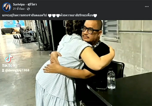 หนูแหม่มยังได้เขียนข้อความสุดซึ้งว่า “แกจะอยู่ในความทรงจำฉันตลอดไป ด้วยความอาลัยรักนะเพื่อน” หลังโพสต์ดังกล่าวเผยแพร่ออกไป ได้มีคนในวงการบันเทิงและแฟนคลับเข้ามาร่วมแสดงความเสียใจเป็นจำนวนมาก