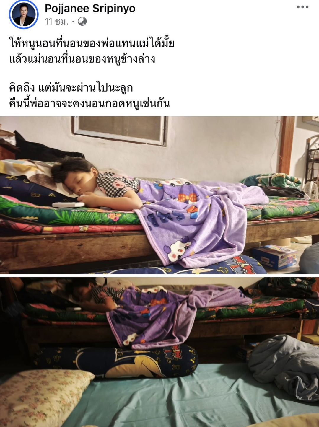 โดยในโพสต์ดังกล่าวระบุข้อความที่เป็นบทสนทนาสั้นๆ ระหว่างแม่ลูกว่า "ให้หนูนอนที่นอนของพ่อแทนแม่ได้มั้ย แล้วแม่นอนที่นอนของหนูข้างล่าง" ภาพเผยให้เห็น ‘น้องเอวา’ นอนหลับอยู่บนเตียงไม้ซึ่งเป็นที่นอนประจำของ 'คุณพ่อแดนนี่'ผู้ล่วงลับ โดยมีคุณแม่ลงมาปูที่นอนอยู่ที่พื้นข้างเตียงแทน เพื่อตามใจลูกสาวที่อยากสัมผัสไออุ่นและระลึกถึงความทรงจำที่มีต่อพ่อ คุณแม่ได้เขียนข้อความปลอบโยนลูกสาวและให้กำลังใจตัวเองผ่านแคปชั่นว่า "คิดถึง แต่มันจะผ่านไปนะลูก คืนนี้พ่ออาจจะคงนอนกอดหนูเช่นกัน" ซึ่งสะท้อนให้เห็นถึงความพยายามของคนเป็นแม่ที่ต้องเข้มแข็งเพื่อประคับประคองความรู้สึกของลูกในช่วงเวลาที่ยากลำบากที่สุด