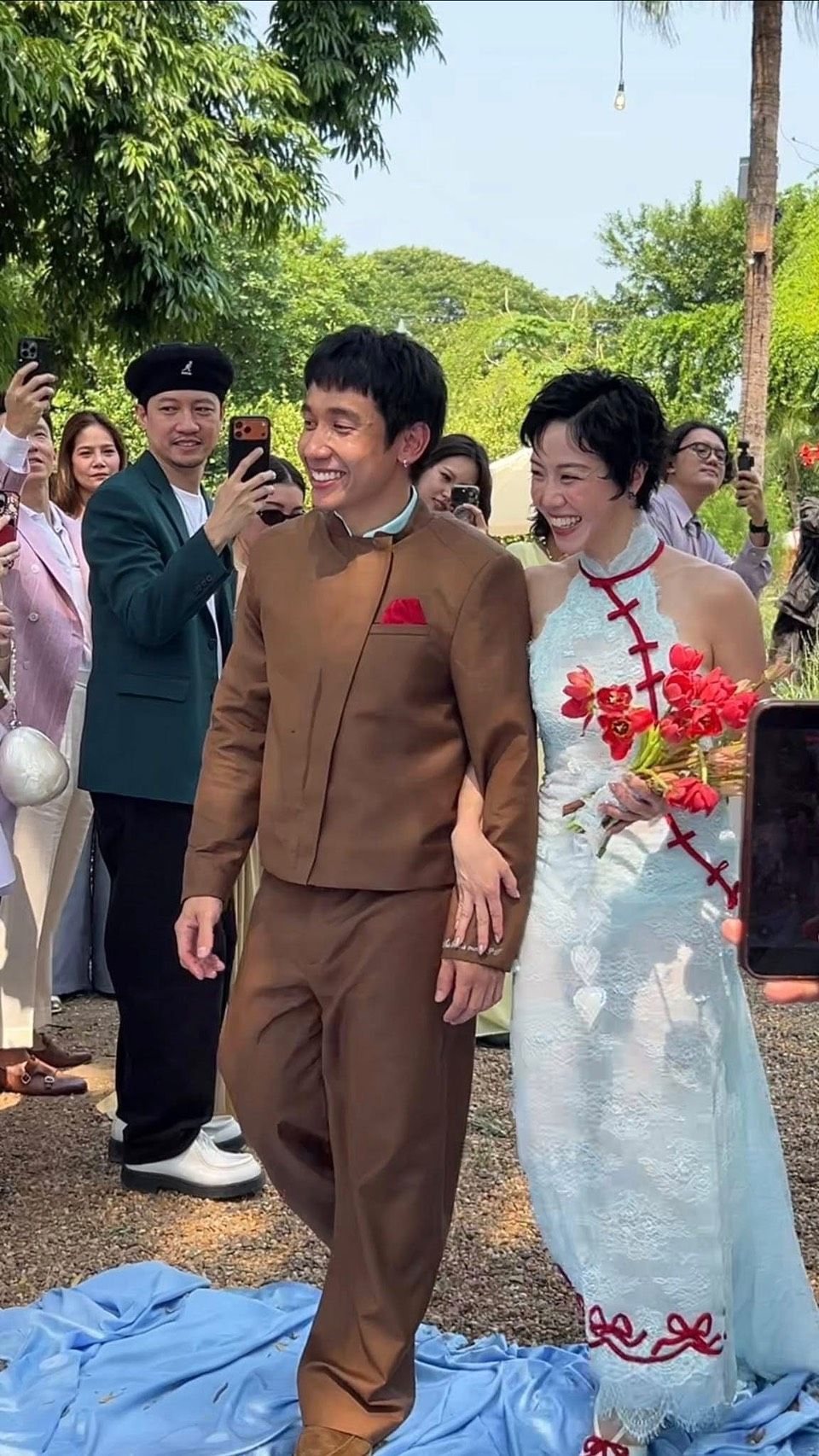 บรรยากาศภายในงานพิธีถูกจัดขึ้นอย่างอบอุ่น โดยมีไฮไลท์ที่สะดุดตาคือชุดเจ้าสาวของพลอยที่มาในชุดกี่เพ้าลูกไม้สีฟ้าอ่อน ดีไซน์ทันสมัยแต่ยังคงความคลาสสิกตามสไตล์ตัวแม่แฟชั่น ส่วนเจ้าบ่าวอย่างหนุ่มเต มาในชุดสูทสีน้ำตาลดีไซน์เรียบเท่ พร้อมรอยยิ้มที่เต็มไปด้วยความสุขตลอดทั้งงานภายในงานมีครอบครัวของทั้งสองฝ่าย รวมถึงเพื่อนสนิทที่มาร่วมเป็นสักขีพยานในวันสำคัญนี้ ท่ามกลางบรรยากาศการตกแต่งที่ใช้โทนสีแดงและฟ้า สื่อถึงความสดใสและการเริ่มต้นชีวิตคู่ที่สมบูรณ์แบบเส้นทางความรักคู่รัก พลอย-เต ถือเป็นอีกหนึ่งคู่ที่แฟนๆ ต่างลุ้นและให้กำลังใจมาโดยตลอด ด้วยไลฟ์สไตล์ที่เข้ากันได้อย่างลงตัว ทั้งเรื่องแฟชั่น ดนตรี และความขี้เล่นที่เป็นเอกลักษณ์ของทั้งคู่ ทำให้งานหมั้นและจดทะเบียนสมรสครั้งนี้กลายเป็นโมเมนต์ที่น่าจดจำและถูกแชร์ต่อในโลกโซเชียลอย่างรวดเร็วเสียงยินดีจากแฟนคลับทันทีที่มีการเผยแพร่ภาพบรรยากาศงานหมั้น เหล่าแฟนคลับต่างเข้ามาคอมเมนต์แสดงความยินดีผ่านแฮชแท็กบนโซเชียลมีเดีย โดยส่วนใหญ่ชื่นชมในความน่ารักและความเป็นธรรมชาติของทั้งคู่ พร้อมอวยพรให้ชีวิตคู่ของทั้งสองเต็มไปด้วยความสุขและเสียงหัวใจตลอดไป