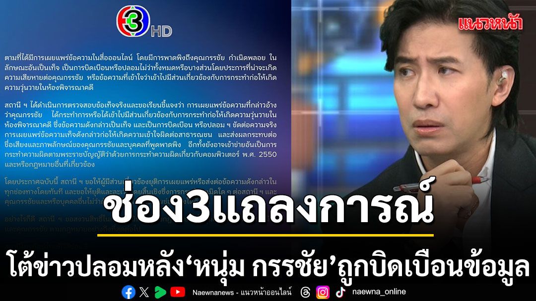 สถานีวิทยุโทรทัศน์ไทยทีวีสีช่อง 3 ออกประกาศแถลงการณ์กรณีพบการเผยแพร่ข้อมูลอันเป็นเท็จพาดพิงถึง "หนุ่ม กรรชัย กำเนิดพลอย" พิธีกรชื่อดัง โดยยืนยันจะดำเนินกระบวนการทางกฎหมายให้ถึงที่สุด สืบเนื่องจากมีการเผยแพร่ข้อความผ่านสื่อสังคมออนไลน์ โดยมีการพาดพิงถึง ‘หนุ่ม’กรรชัย กำเนิดพลอย ในลักษณะที่บิดเบือน หรือปลอมแปลงข้อมูล ซึ่งส่งผลให้เกิดความเสียหายต่อชื่อเสียง ภาพลักษณ์ และอาจสร้างความเข้าใจผิดให้แก่สาธารณชน รวมถึงความวุ่นวายในกระบวนการพิจารณาคดีต่างๆ ที่เกี่ยวข้องซึ่งทางช่อง 3 ได้ตรวจสอบข้อเท็จจริงและชี้แจงว่า ข้อมูลที่ถูกเผยแพร่นั้น "ไม่เป็นความจริง" และถือเป็นการละเมิดสิทธิอย่างร้ายแรง ทำให้สถานีวิทยุโทรทัศน์ไทยทีวีสีช่อง 3 ออกแถลงการณ์อย่างเป็นทางการผ่านสื่อโซเชียลมีเดีย