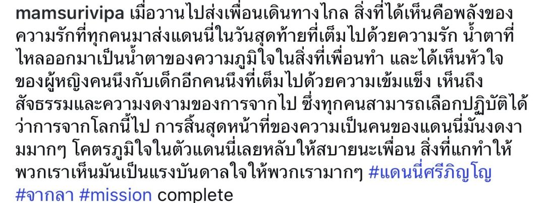 โดย แหม่ม สุริวิภา ได้เปิดใจผ่านโซเชียลมีเดียถึงการสูญเสียในครั้งนี้ว่า “น้ำตาจะไหล... มาส่งเพื่อนเดินทางไกล บ้านของแดนนี่ต้อนรับเพื่อนในวงการอย่างอบอุ่น มีแม่และน้องเอวาคอยต้อนรับทุกคน” พร้อมทั้งระบุว่าเป็นภารกิจสุดท้ายที่ตั้งใจมาทำให้เพื่อนรักด้วยหัวใจ