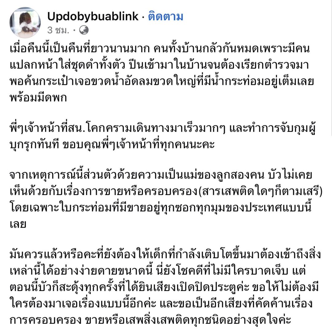 โดยวันนี้ (24 เม.ย. 69) บัว โพสต์ข้อความผ่านเฟซบุ๊กว่า "เมื่อคืนนี้เป็นคืนที่ยาวนานมาก คนทั้งบ้านกลัวกันหมดเพราะมีคนแปลกหน้าใส่ชุดดำทั้งตัว ปีนเข้ามาในบ้านจนต้องเรียกตำรวจมา พอค้นกระเป๋าเจอขวดน้ำอัดลมขวดใหญ่ที่มีน้ำกระท่อมอยู่เต็มเลยพร้อมมีดพก พี่ ๆ เจ้าหน้าที่ สน.โคกคราม เดินทางมาเร็วมาก ๆ และทำการจับกุมผู้บุกรุกทันที ขอบคุณพี่ ๆ เจ้าหน้าที่ทุกคนนะคะ จากเหตุการณ์นี้ส่วนตัวด้วยความเป็นแม่ของลูกสองคน บัวไม่เคยเห็นด้วยกับเรื่องการขายหรือครอบครอง (สารเสพติดใด ๆ ก็ตามเสรี) โดยเฉพาะใบกระท่อมที่มีขายอยู่ทุกซอกทุกมุมของประเทศแบบนี้เลย มันควรแล้วหรือคะที่ยังต้องให้เด็กที่กำลังเติบโตขึ้นมาต้องเข้าถึงสิ่งเหล่านี้ได้อย่างง่ายดายขนาดนี้ นี่ยังโชคดีที่ไม่มีใครบาดเจ็บ แต่ตอนนี้บัวก็สะดุ้งทุกครั้งที่ได้ยินเสียงเปิดปิดประตูค่ะ ขอให้ไม่ต้องมีใครต้องมาเจอเรื่องแบบนี้อีกค่ะ และขอเป็นอีกเสียงที่คัดค้านเรื่องการครอบครองหรือขายเสพสิ่งเสพติดทุกชนิดอย่างสุดใจค่ะ"และ "ขอบคุณพี่ ๆ ตำรวจ สน.โคกครามค่ะ และขอบคุณปะป๊ากับตาตาที่ปกป้องพวกเรา" ท่ามกลางแฟน ๆ ที่เข้ามาคอมเมนต์แสดงความห่วงใยกันอย่างต่อเนื่อง