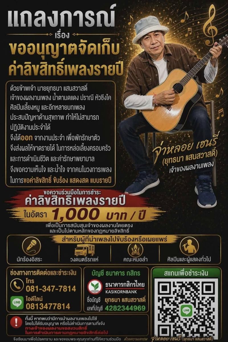 ด้วยเหตุนี้ จึงขอความเมตตาจากพี่น้องศิลปินและคนในวงการบันเทิงที่นำผลงานเพลงของตนไปใช้ขับร้องแสดงสด โดยขอจัดเก็บค่าลิขสิทธิ์ในรูปแบบรายปี อัตราเพียง 1,000 บาทต่อปี เพื่อเป็นการสนับสนุนเจ้าของผลงานโดยตรงและปฏิบัติตามกฎหมายลิขสิทธิ์
