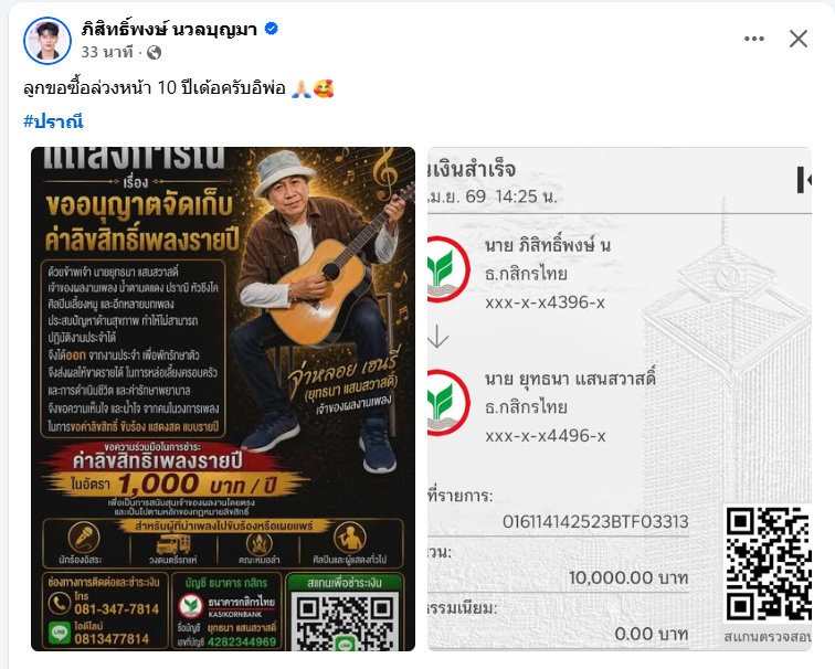ด้าน “อ้ายแมน” ภิสิทธิ์พงษ์ นวลบุญมา ศิลปินลูกทุ่งอีสานที่กำลังมาแรง ได้สร้างปรากฏการณ์น้ำใจงามด้วยการโพสต์ภาพสลิปการโอนเงินจำนวน 10,000 บาท ให้กับจ่าหลอย เฮนรี่ พร้อมระบุข้อความสุดซึ้งว่า "ลูกขอซื้อล่วงหน้า 10 ปีเด้อครับอิพ่อ" พร้อมติดแฮชแท็กเพลง #ปราณี ซึ่งเป็นหนึ่งในผลงานของจ่าหลอยที่สร้างชื่อเสียงให้เขาเช่นกัน