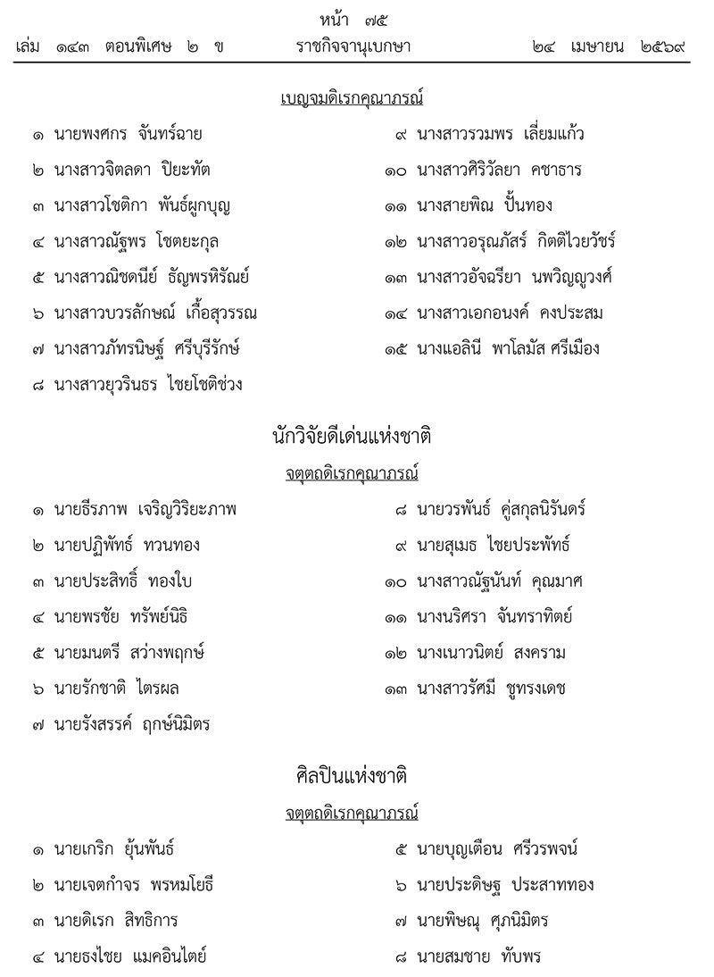 เมื่อวันที่ 23 เมษายน 2569 ที่ผ่านมา เว็บไซต์ราชกิจจานุเบกษา เผยแพร่ ประกาศ เรื่อง พระราชทานเครื่องราชอิสริยาภรณ์อันเป็นที่เชิดชูยิ่งช้างเผือกและเครื่องราชอิสริยาภรณ์อันมีเกียรติยศยิ่งมงกุฎไทย ชั้นสายสะพาย ประจำปี 2568