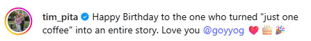 โดยเจ้าตัวได้โพสต์ภาพบรรยากาศฉลองวันเกิดแบบเรียบง่ายแต่อบอุ่น พร้อมข้อความว่า “Happy Birthday to the one who turned ‘just one coffee’ into an entire story. Love you @goyyog” (สุขสันต์วันเกิด คนที่เปลี่ยน ‘แค่กาแฟหนึ่งแก้ว’ ให้กลายเป็นเรื่องราวทั้งหมด รักคุณ)