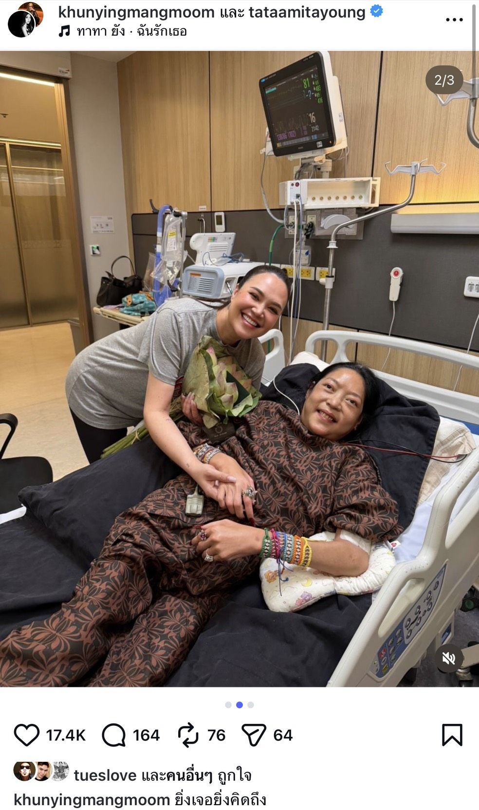 จากภาพที่ปรากฏในอินสตาแกรมส่วนตัว ทาทา ยัง ได้เข้าไปสวมกอดและให้กำลังใจคุณหญิงแมงมุมอย่างใกล้ชิด ซึ่งทาทาได้นำดอกบัวช่อใหญ่มามอบให้ เพื่อเป็นการแสดงความห่วงใยและส่งพลังใจในการสู้กับอาการป่วยแม้คุณหญิงแมงมุมจะยังคงต้องพักรักษาตัวและมีอุปกรณ์ทางการแพทย์คอยดูแลอย่างใกล้ชิด แต่ในภาพจะเห็นได้ว่าคุณหญิงยังมีรอยยิ้มที่สดใสเมื่อได้พบกับเพื่อนรัก โดย’ทาทา’ได้โพสต์ภาพพร้อมข้อความสื่อถึงความคิดถึงและความผูกพันที่มีให้กัน