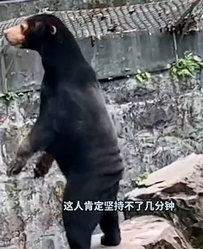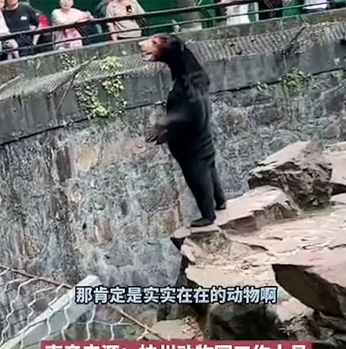 คลิปวีดีโอเผยให้เห็นสิ่งมีชีวิตที่เอื้อมมือไปหยิบขนมที่ถูกโยนเข้าไปในกรงของมัน แต่มันกลับไม่สามารถจับไว้ได้และกลายเป็นภาพที่น่าขบขัน แต่เนื่องจากมันยืนตัวตรงบนขาหลังอันเรียวยาว ชาวเน็ตจึงสงสัยว่าหมีในสวนสัตว์เป็นของจริงหรือไม่ อีกด้านหนึ่ง ทางสวนสัตว์ก็ไม่นิ่งนอนใจ โดยโฆษกรีบชี้แจงว่าการหลอกลวงจะไม่เกิดขึ้นในสถานที่ที่ดูแลโดยรัฐ และมนุษย์ในชุดหมีขนสัตว์ไม่สามารถอยู่ได้เกิน 2-3 นาที เพราะจากนั้นก็จะล้มลง ด้วยอุณหภูมิ 40 องศาเซลเซียส ในฤดูร้อน