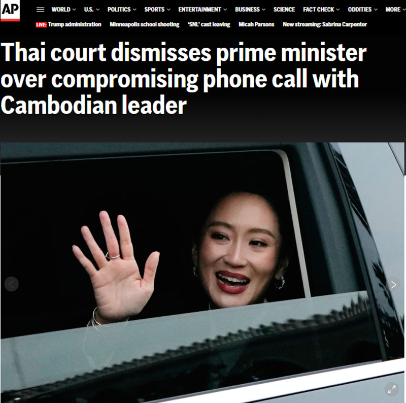 ขณะที่ แอสโซซิเอเต็ด เพรส (Associated Press 'AP' ) พาดหัวข่าวระบุว่า Thai court dismisses prime minister over compromising phone call with Cambodian leader (ศาลไทยสั่งปลดนายกฯ พ้นตำแหน่ง ปมโทรศัพท์คุยประนีประนอมกับผู้นำกัมพูชา) ทางสำนักข่าว AP ระบุว่า ศาลรัฐธรรมนูญของไทยได้มีคำพิพากษาให้ น.ส.แพทองธาร ชินวัตร พ้นจากตำแหน่งนายกรัฐมนตรี โดยวินิจฉัยว่าในฐานะผู้นำประเทศ เธอได้ละเมิดหลักจริยธรรมตามรัฐธรรมนูญ ในระหว่างการโทรศัพท์คุยกับฮุน เซน