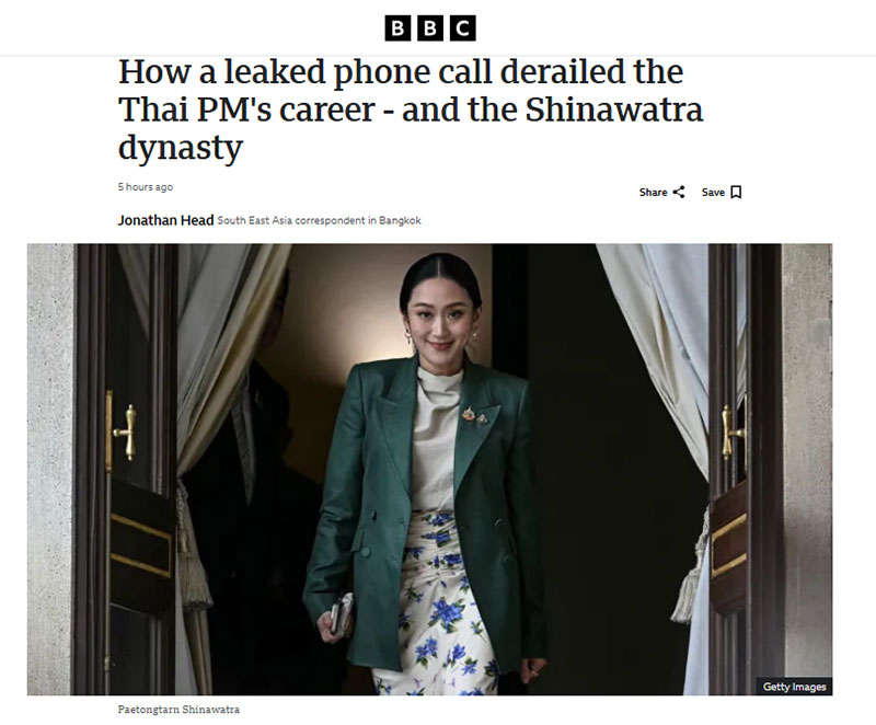 ทางด้านสำนักข่าวบีบีซ๊ (BBC) ได้พาดหัวว่า How a leaked phone call derailed the Thai PM's career - and the Shinawatra dynasty (คลิปเสียงหลุดเส้นทางอาชีพนายกฯ ไทย และตระกูลชินวัตรอย่างไร) ทางบีบีซี ได้ออกมาระบุว่า ศาลรัฐธรรมนูญของไทยลงมติปลดนายกรัฐมนตรีออกจากตำแหน่งอีกครั้ง ซึ่งในเดือน ก.ค. ผู้พิพากษา 7 ใน 9 คนของศาลได้ลงมติให้พักงาน น.ส.แพทองธาร ดังนั้น คำตัดสินในวันนี้จึงไม่ใช่เรื่องน่าประหลาดใจ