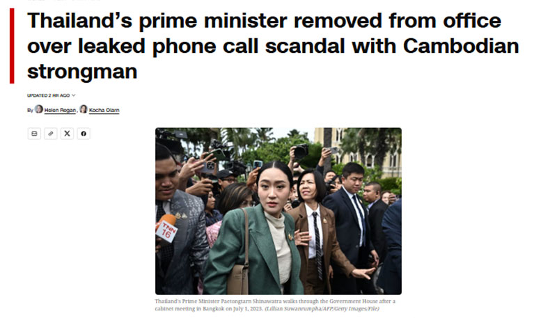 ทางซีเอ็นเอ็น (CNN) พาดหัวแรงว่า Thailand’s prime minister removed from office over leaked phone call scandal with Cambodian strongman (นายกฯ ไทยถูกปลดจากตำแหน่ง หลังมีกรณีฉาวคลิปเสียงหลุดกับผู้มากบารมีของกัมพูชา) เนื้อหาสำคัญระบุว่า ศาลไทยได้มีคำสั่งให้นายกรัฐมนตรี แพทองธาร ชินวัตร พ้นจากตำแหน่ง โดยวินิจฉัยว่า การโทรศัพท์สนทนาระหว่างเธอกับอดีตผู้นำกัมพูชา ถือเป็นการละเมิดหลักจริยธรรม ส่งผลให้ประเทศไทยเข้าสู่ความวุ่นวายทางการเมืองครั้งใหม่ แพทองธาร สมาชิกตระกูลชินวัตรผู้ทรงอิทธิพลทางการเมือง กลายเป็นนายกรัฐมนตรีที่อายุน้อยที่สุดของประเทศไทยในเดือน ส.ค. 2567 และดำรงตำแหน่งได้เพียงปีเดียว พร้อมทั้ง CNN ได้ระบุว่า "คำวินิจฉัยของศาลรัฐธรรมนูญ ถือเป็นอีกหนึ่งกระแสความวุ่นวายที่เกิดขึ้นในการเมืองไทย"