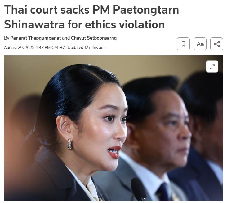 โดยทางสำนักข่าวรอยเตอร์ส (Reuters) ได้ออกมาพาดหัวว่า Thai court sacks PM Paetongtarn Shinawatra for ethics violation (ศาลไทยสั่งปลดนายกฯ แพทองธาร ชินวัตร ฐานละเมิดจริยธรรม) เนื้อความได้ระบุใจความว่า ศาลรัฐธรรมนูญของไทยมีคำพิพากษาให้ถอดถอนนายกรัฐมนตรีแพทองธาร ชินวัตร ออกจากตำแหน่ง เนื่องจากละเมิดหลักจริยธรรม หลังจากดำรงตำแหน่งได้เพียงปีเดียว นับเป็นการโจมตีครั้งสำคัญอีกครั้งต่อตระกูลชินวัตร ซึ่งอาจนำไปสู่ความวุ่นวายอีกครั้ง