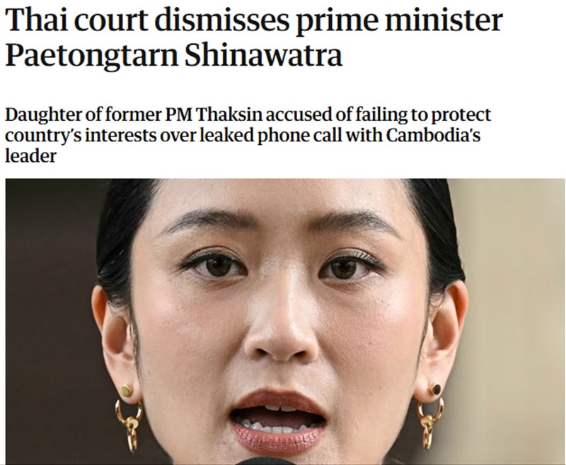 ต่อมาทาง เดอะการ์เดียน (The Guardian) พาดหัวข่าวไว้ว่า Thai court dismisses prime minister Paetongtarn Shinawatra (ศาลไทยสั่งปลดนายกฯ แพทองธาร ชินวัตร) เนื้อหาใจความระบุว่า ศาลรัฐธรรมนูญของไทยมีคำพิพากษาให้ น.ส.แพทองธาร ชินวัตร พ้นจากตำแหน่งนายกรัฐมนตรี โดยวินิจฉัยว่าในฐานะผู้นำประเทศ เธอได้ละเมิดหลักจริยธรรมตามรัฐธรรมนูญระหว่างการสนทนาทางโทรศัพท์กับฮุน เซน ประธานวุฒิสภากัมพูชา คำพิพากษาดังกล่าวซึ่งนำไปสู่ภาวะไร้เสถียรภาพครั้งใหม่ในประเทศ ทำให้เธอต้องถูกปลดออกจากตำแหน่งทันที ซึ่งเธอดำรงตำแหน่งมาประมาณ 1 ปีเท่านั้น
