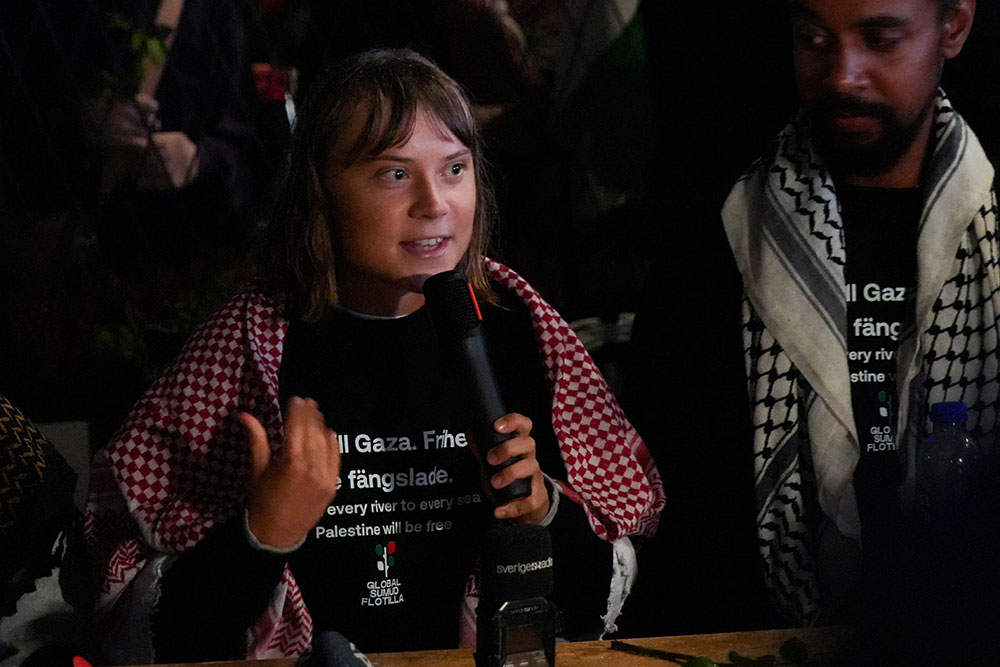 'เกรต้า ธันเบิร์ก' เดินทางไปบนเรือเพื่อนำสิ่งของความช่วยเหลือไปให้ชาวปาเลสไตน์ในฉนวนกาซา ที่ต้องกลายเป็นผู้พลัดถิ่นจากการทำสงครามของอิสราเอล และกำลังประสบภาวะวิกฤตด้านมนุษยธรรมเพราะอิสราเอลปิดกั้นความช่วยเหลือที่ส่งเข้าไปในฉนวนกาซา โดยเธอและคนบนเรือจำนวน 478 คนถูกทางการอิสราเอลจับกุมก่อนถูกเนรเทศออกจากอิสราเอลเมื่อวันที่ 6 ตุลาคมที่ผ่านมา