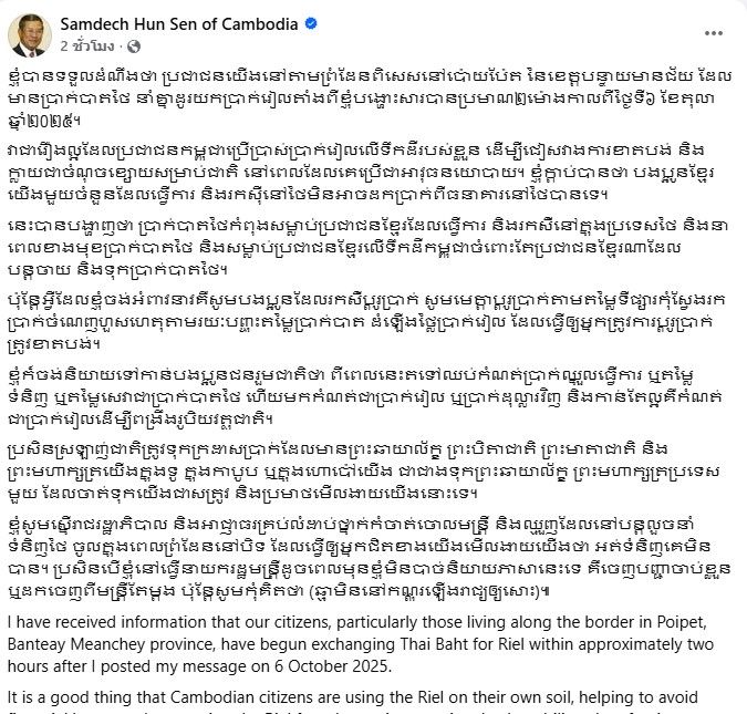 เมื่อวันที่ 8 ต.ค.2568 ฮุน เซน ประธานวุฒิสภากัมพูชา ได้โพสต์ข้อความผ่านเฟซบุ๊ก ระบุว่า "ข้าพเจ้าได้รับข้อมูลว่า ประชาชนของเรา โดยเฉพาะผู้ที่อาศัยอยู่ตามแนวชายแดนปอยเปต จังหวัดบ็อนเตียย์เมียนเจ็ย ได้เริ่มแลกเปลี่ยนเงินบาทเป็นเงินเรียล ภายในเวลา 2 ชั่วโมง หลังจากที่ข้าพเจ้าโพสต์ข้อความเชิญชวนเมื่อวันที่ 6 ตุลาคมที่ผ่านมา