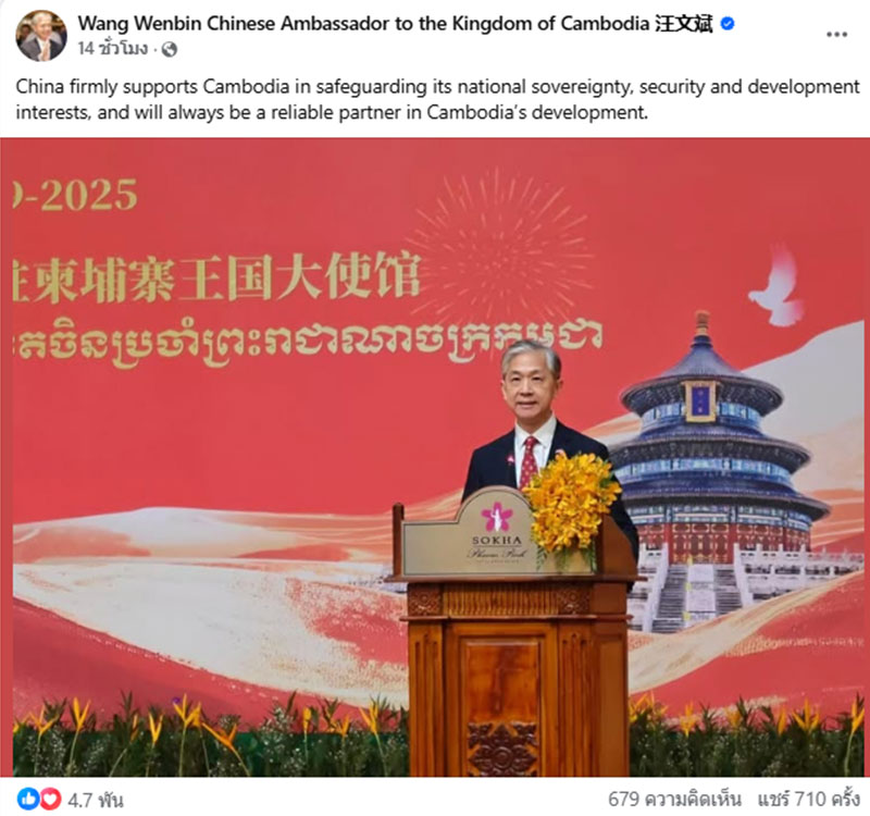 9 ตุลาคม 2568 สำนักข่าวต่างประเทศรายงานว่า 'หวัง เหวินปิน' (Wang Wenbin) เอกอัครราชทูตจีนประจำกัมพูชา ได้ออกมาโพสต์ข้อความผ่านทางเฟซบุ๊กส่วนตัว "Wang Wenbin Chinese Ambassador to the Kingdom of Cambodia 汪文斌" ระบุข้อความว่า ... "China firmly supports Cambodia in safeguarding its national sovereignty, security and development interests, and will always be a reliable partner in Cambodia’s development." (จีนสนับสนุนกัมพูชาอย่างมั่นคงในการปกป้องอำนาจอธิปไตยของชาติ ความมั่นคงและผลประโยชน์ด้านการพัฒนา และจะเป็นพันธมิตรที่เชื่อถือได้ในการพัฒนาของกัมพูชา)