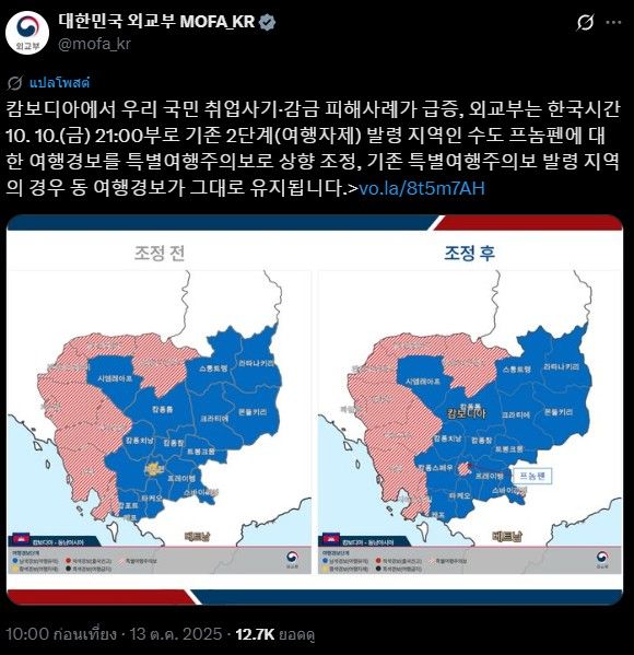เมื่อวันที่ 13 ต.ค.2568 เพจเฟซบุ๊ก "กองทัพบก ทันกระแส" ได้โพสต์ข้อความอ้างอิงจากกระทรวงการต่างประเทศสาธารณรัฐเกาหลี ที่โพสต์ผ่านบัญชี X โดยระบุว่า "เกาหลีใต้เตือนประชาชนห้ามเดินทางไปยังกัมพูชา