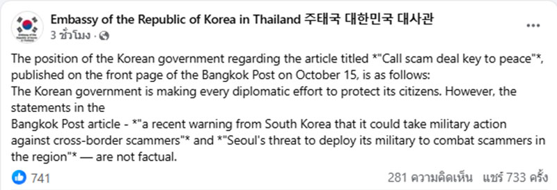 15 ตุลาคม 2568 เฟซบุ๊กเพจ 'Embassy of the Republic of Korea in Thailand 주태국 대한민국 대사관' ที่มีผู้ติดตาม 2.8 หมื่นคน ได้ออกมาโพสต์ข้อความระบุว่า สำนักข่าวแห่งหนึ่งในไทย ซึ่งพาดหัวว่า “Call scam deal key to peace” (ข้อตกลงเรื่องแก๊งคอลเซ็นเตอร์คือกุญแจสู่สันติภาพ) บนหน้าหนึ่งของหนังสือพิมพ์ฉบับดังกล่าว ในวันที่ 15 ตุลาคม