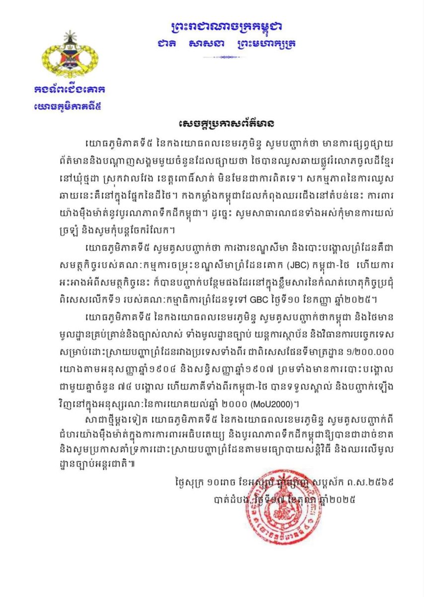 กองทัพภาคที่ 5 กองทัพกัมพูชา ขอเน้นย้ำว่า งานปักปันเขตแดนเป็นความรับผิดชอบของคณะกรรมการเขตแดนร่วม (JBC) และได้รับการยืนยันเพิ่มเติมในรายงานการประชุมพิเศษครั้งที่ 1 ของคณะกรรมการเขตแดนทั่วไป (GBC) เมื่อวันที่ 10 ก.ย. 68