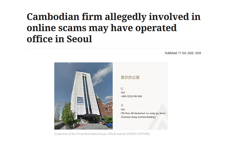 17 ตุลาคม 2568 เว็บไซต์ข่าว Korea Joongang Daily ของประเทศเกาหลีใต้ รายงานว่า เกาหลีใต้พบ 'ปรินซ์ กรุ๊ป' (Prince Group) บริษัทกัมพูชาที่ถูกสหรัฐอเมริกาและสหราชณาจักรคว่ำบาตรจากข้อหาพัวพันกับขบวนการหลอกลวงทางออนไลน์และการค้ามนุษย์ เปิดสำนักงานอยู่ใจกลางกรุงโซล