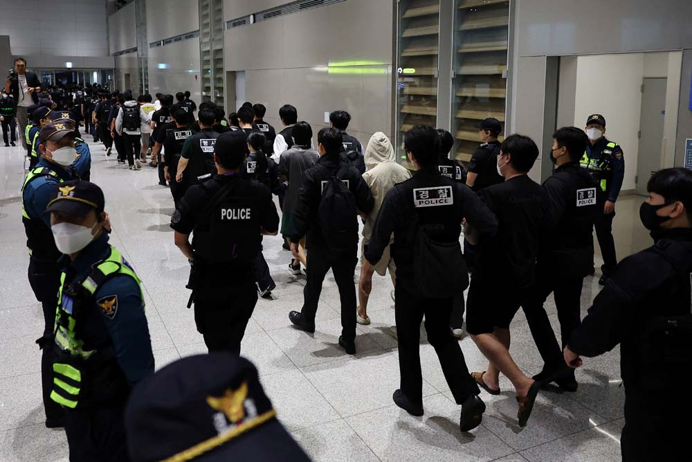 พลเมืองเกาหลีใต้เหล่านี้ถูกควบคุมตัวทันทีที่ขึ้นเครื่องบิน และถูกนำตัวส่งไปยังสถานีตำรวจทั่วประเทศเพื่อทำการสอบสวนถึงการมีส่วนร่วมในกิจกรรมทางอาญา โดยตามกฎหมายแล้ว หมายจับสามารถดำเนินการได้ภายในเครื่องบินที่ติดธงชาติ เนื่องจากถือเป็นส่วนหนึ่งของดินแดนเกาหลีใต้