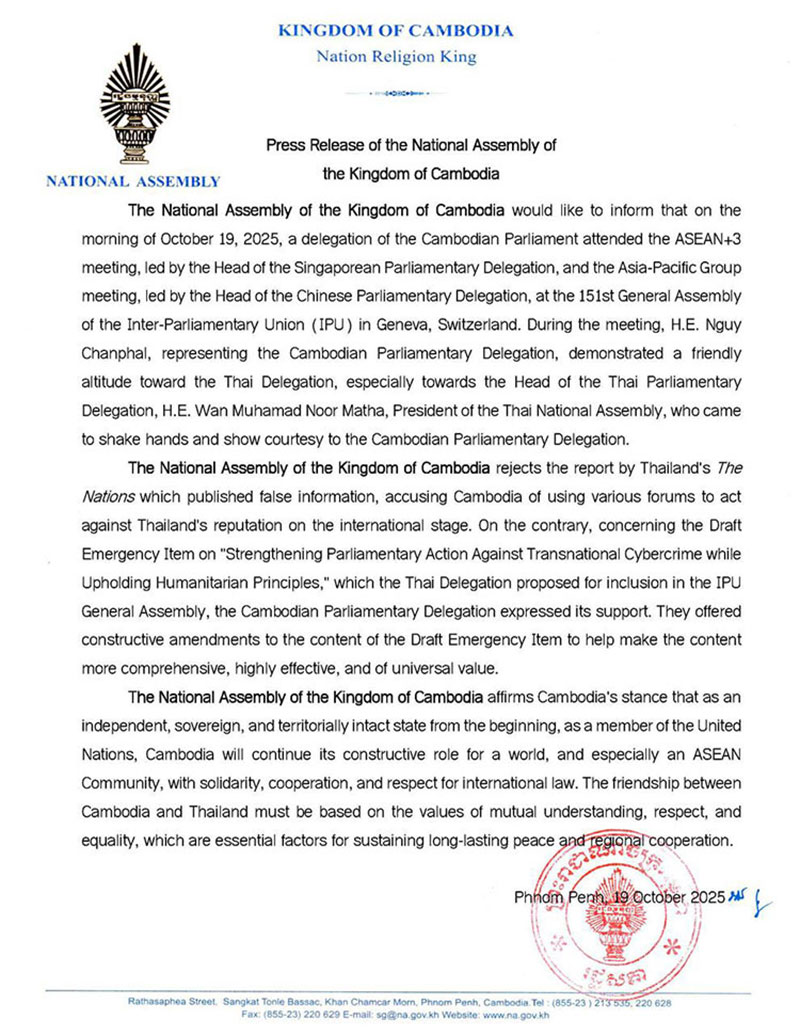 20 ตุลาคม 2568 สำนักข่าวต่างประเทศรายงานว่า รัฐสภากัมพูชาออกแถลงการณ์ปฏิเสธรายงานของสื่อซึ่งระบุว่า กัมพูชาใช้เวทีระหว่างประเทศในการทำลายชื่อเสียงของไทย โดยอ้างว่า เป็นข้อมูลเท็จและบิดเบือนการปฏิบัติการทางการทูตของกัมพูชาในระดับนานาชาติ