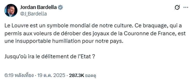 จอร์แดน บาร์เดลลา ผู้นำพรรคพรรคขวาจัด โพสต์บนแพลตฟอร์มเอ็กซ์ส่วนตัว "@J_Bardella" ระบุข้อความว่า "การปล้นพิพิธภัณฑ์ลูฟวร์เป็นความอัปยศเกินทนของฝรั่งเศส เป็นอาการของประเทศที่ไม่สามารถปกป้องมรดกของชาติได้ พร้อมตั้งคำถามว่า รัฐที่ล้มเหลวนี้ยังจะฝืนลากสังขารไปอีกนานแค่ไหน"